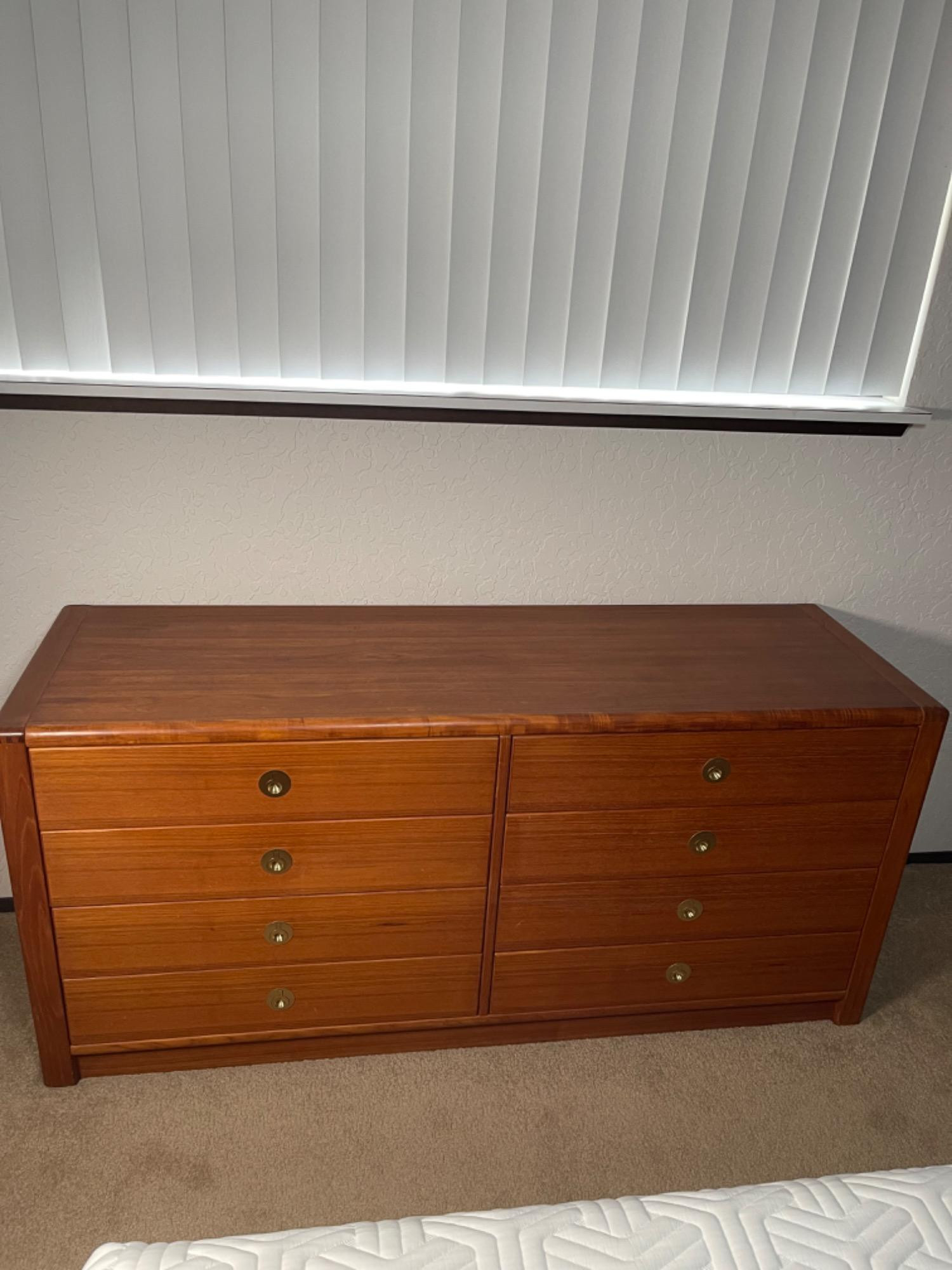 MCM Teak 8 Drawer D-Scan Dresser. Brass recessed pulls. Some minor wear, slight scuffs. Dresser measures- 62L x 29T x 19 D