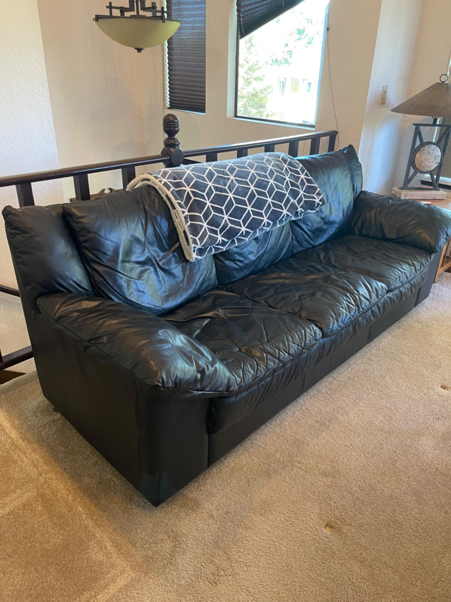 Macy’s Soft Italian Black Leather Couch With Throw-No Rips or Stains, with Throw. Very comfy! 87L x 35W x 29T
