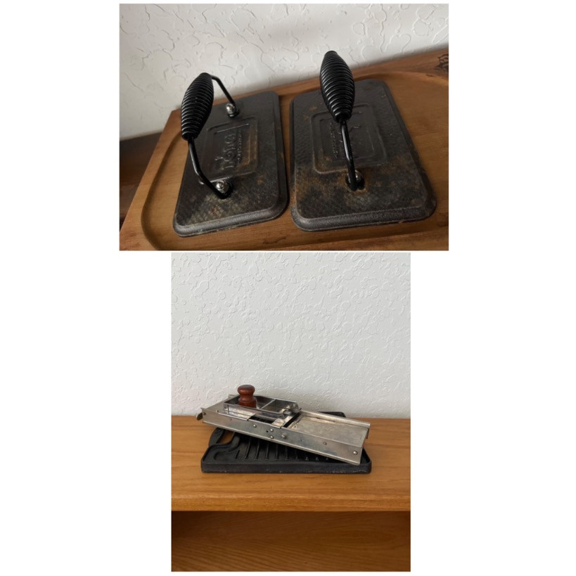 Stainless Steel Madoline Slicer And Cast Iron Meat Grill Presses.