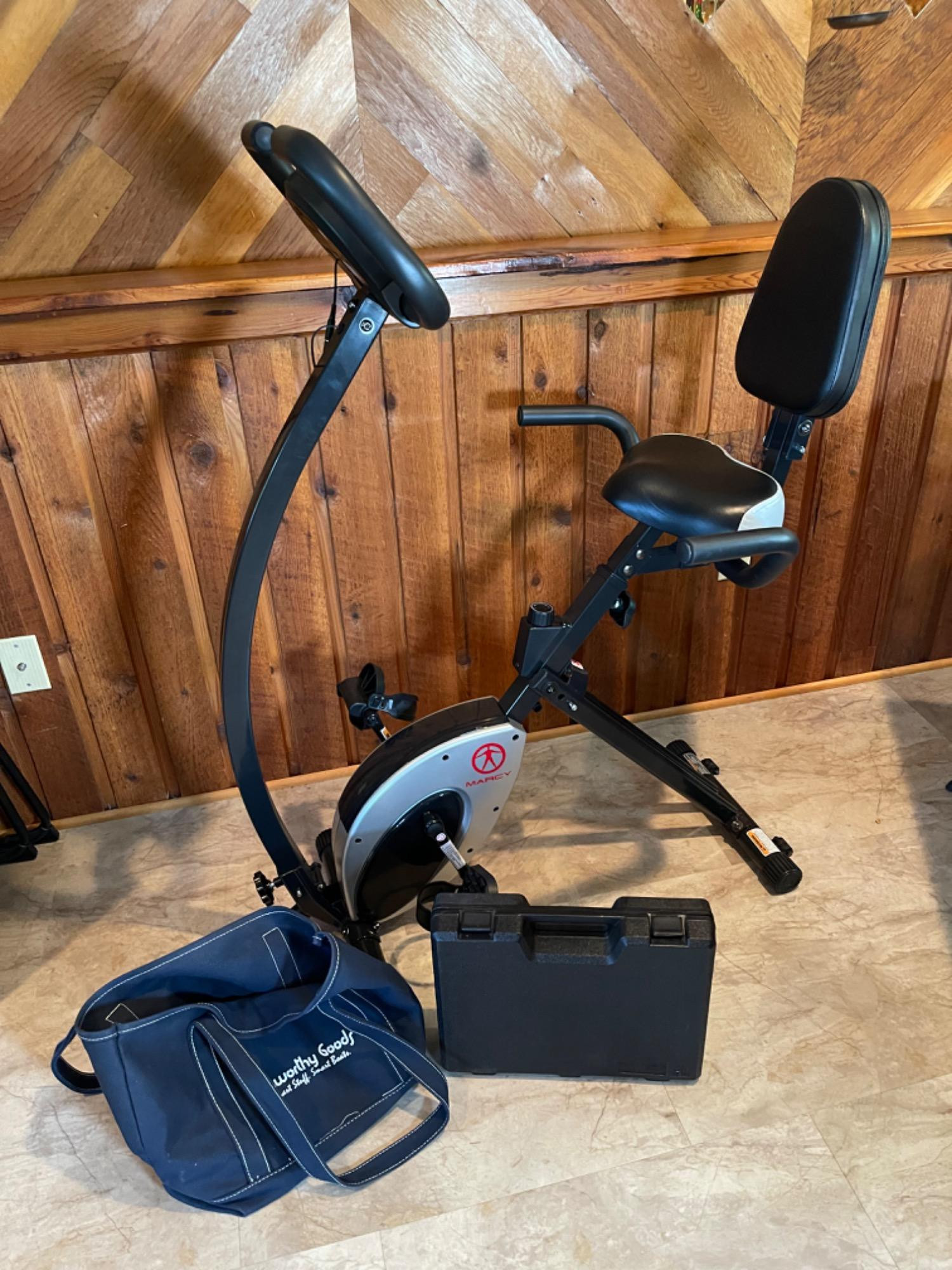 Marcy Foldable Upright Exercise Bike with Adjustable Resistance for Cardio Workout & Strength Training. Weight set in carry box.
