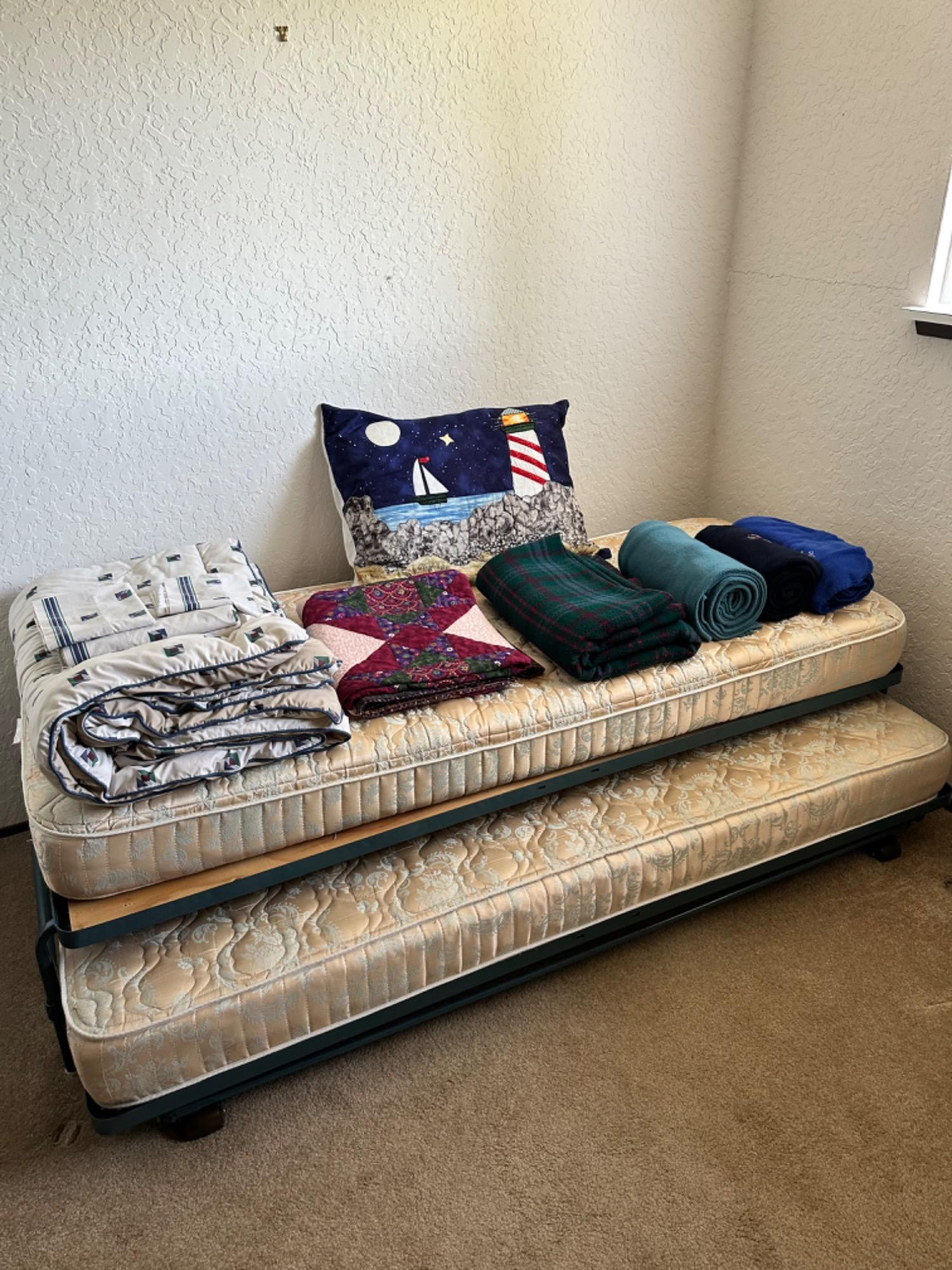 Trundle Twin Bed With Bedding-Comforter, Quilt and Blankets. Mattress well cared for, non Pets/smoking