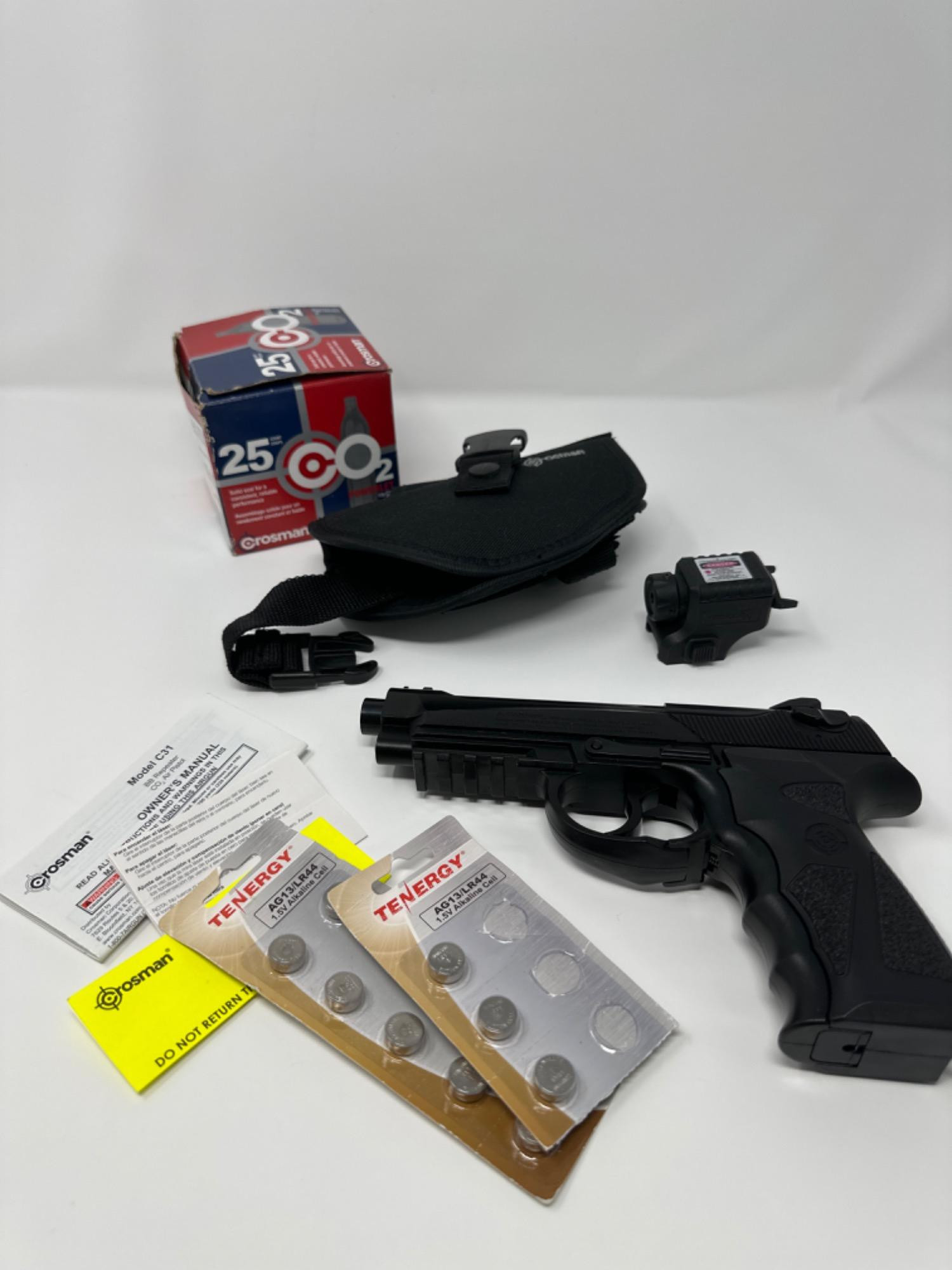 This Crossman handgun comes with CO2 cartridges, a scope, and a carrying case I can be worn on the hip also comes with batteries in the manual