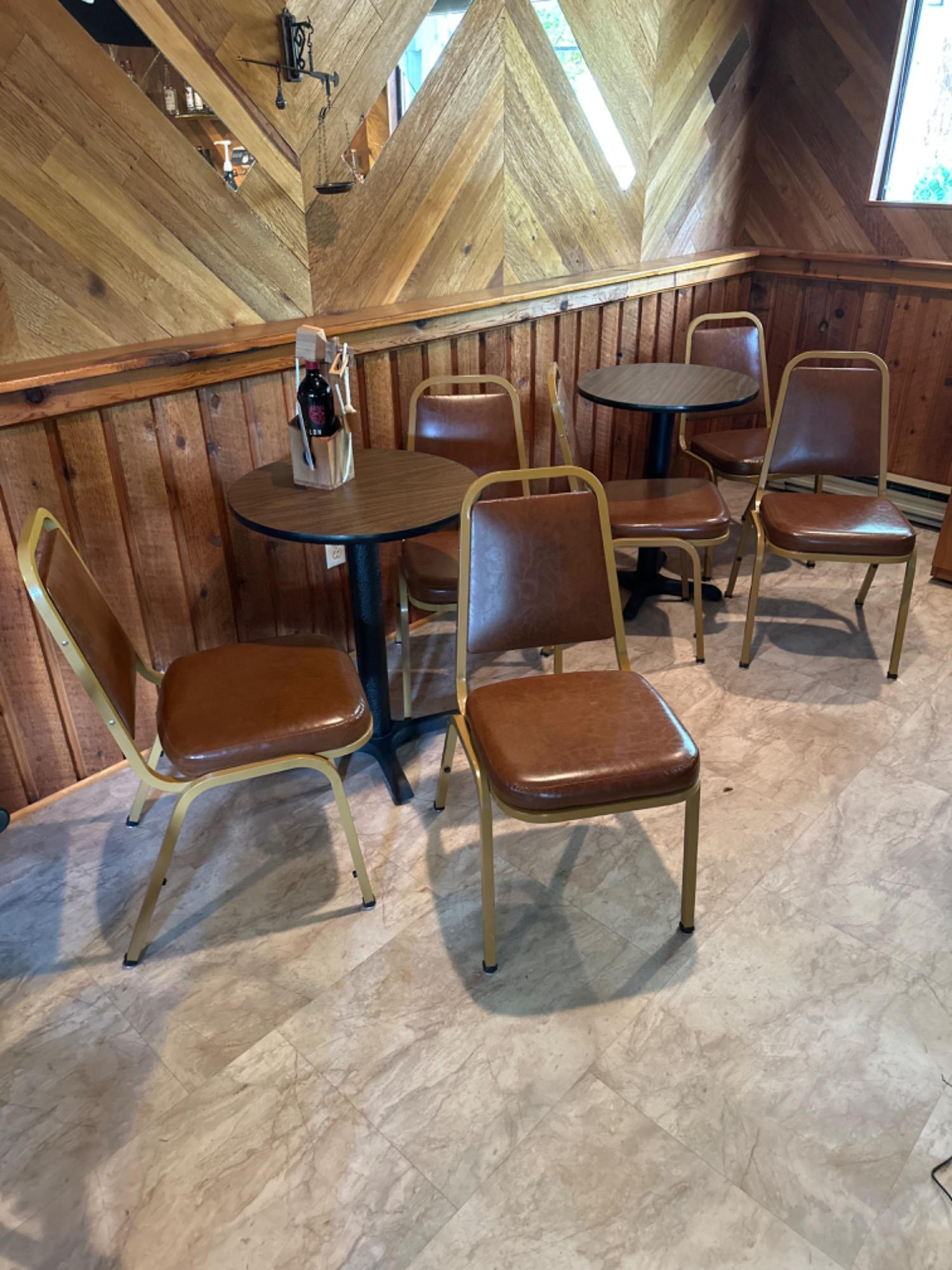 Two Round Side Tables and Six Metal Falcon Vinyl Auditorium Chairs. These two sets come with two tables and six chairs all in excellent shape. The tables are laminate top and they measure 29 inches tall by 23 inches wide. The chairs are 16 inches deep by 16 inches wide by 32 1/2 inches tall the chair brand is Falcon.
