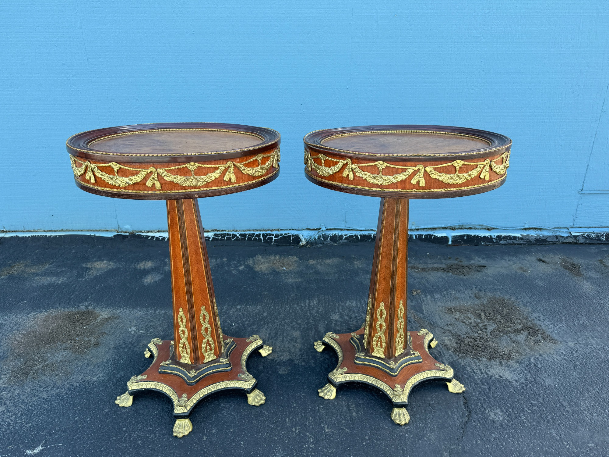 Mid Century 19th C French Style Pedestal Tables Mahogany veneer and burl veneer top. All brass and gold tone fittings are accounted for - some with a patina Some rippling to the wood veneer tops, some vertical cracking on the round pieces - fixable Solid wood construction - great overall condition Measures 29.5” x 20.5"D