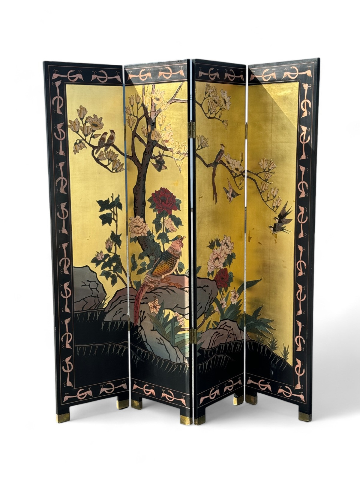 Vintage 4 Panel Chinese Gold Leaf & Black Lacquer Room Divider Folding Screen Gold side - good condition, minor discoloration on some gold spots Black side - etched crane and lily motif - chip to the lacquerware Overall good condition Pins pull out for easy disassembly and travel Each panel measures:72"T x 16"W