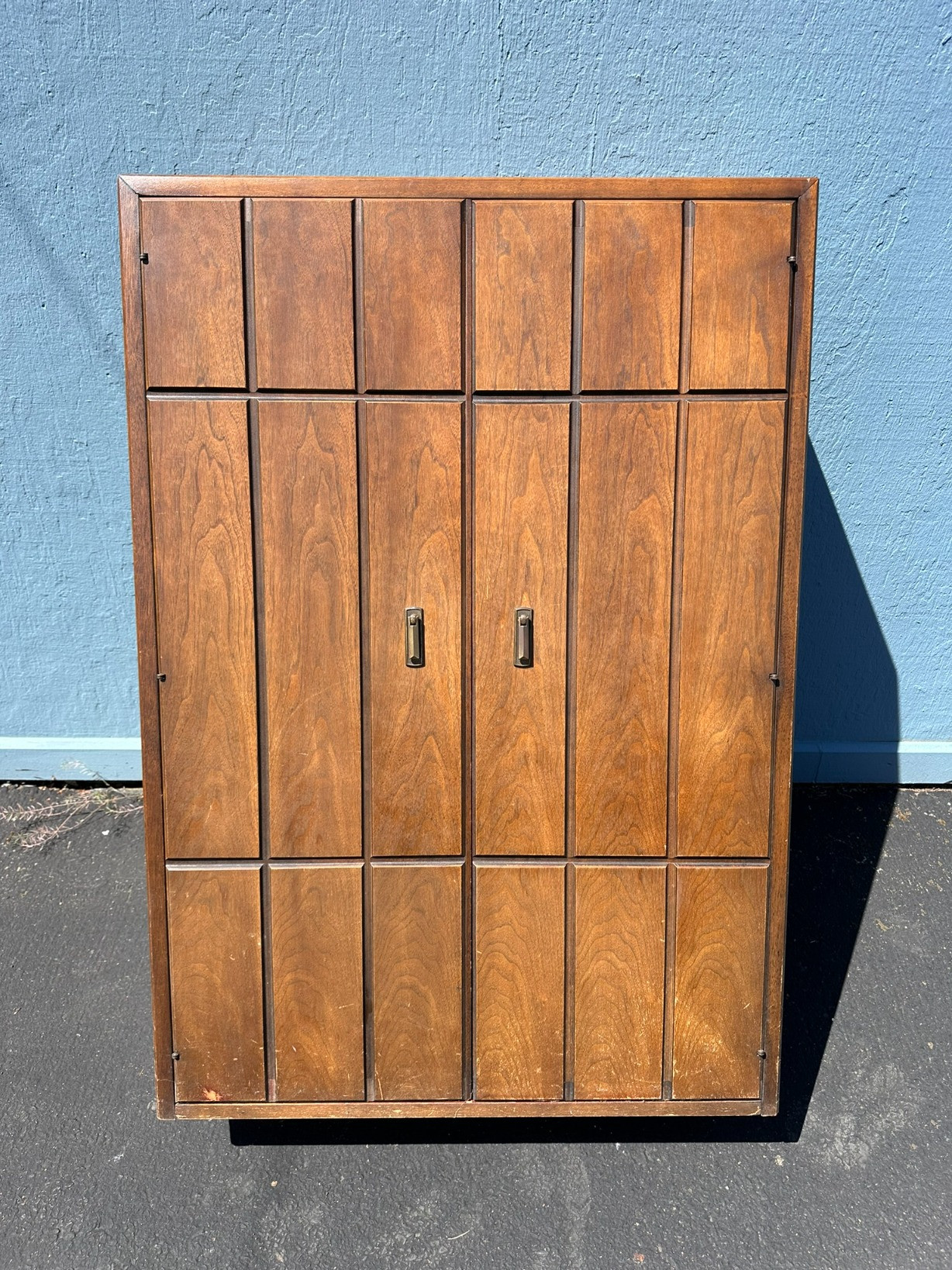 Mid-Century Modern Double Door Wood Cabinet w/ 3 Shelves Wood with veneer - veneer has some wear. One corner needs to be tightened by up Measures: 32" x 12" x approx 60"T
