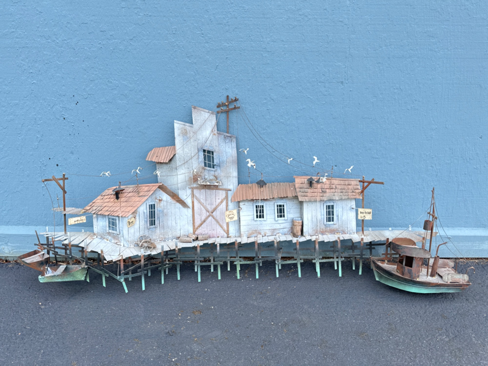 Vtg Buildings with Boat Docks Metal Wall Sculpture - C. Jere Style Measures: 49"L x 21"T at its highest peak x projection of approximately 7" Some wear to white enamel on the seagulls, a piling is crooked