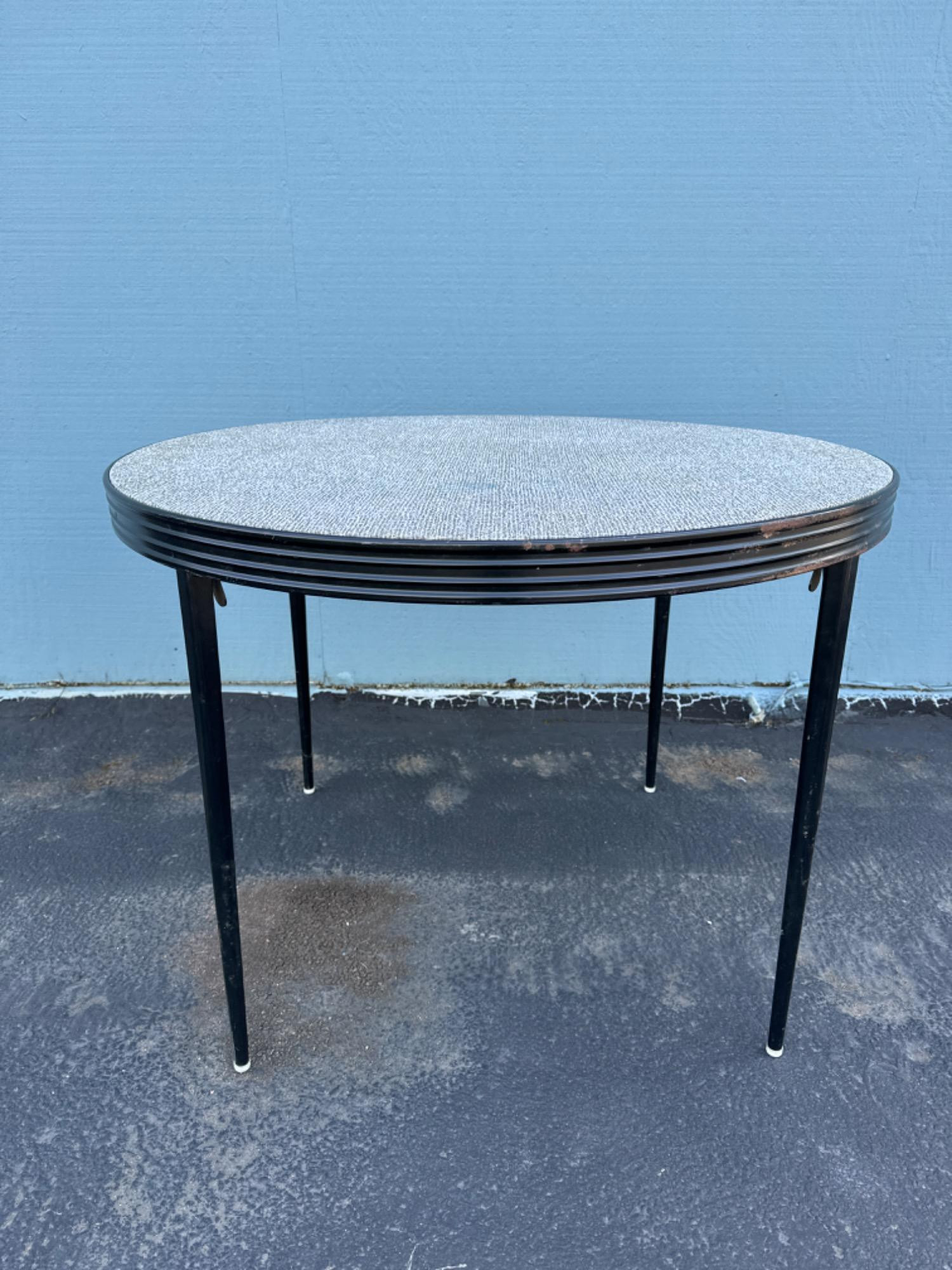 Retro Folding 38" Round Poker Card Table By The Durham Line #38 Measures: 38"D x 28"T Top has 2 spots that have been smoothed/loss of texture. Majority of metal is in great condition, spot that had contact with the floor has rust/loss of black paint Sturdy