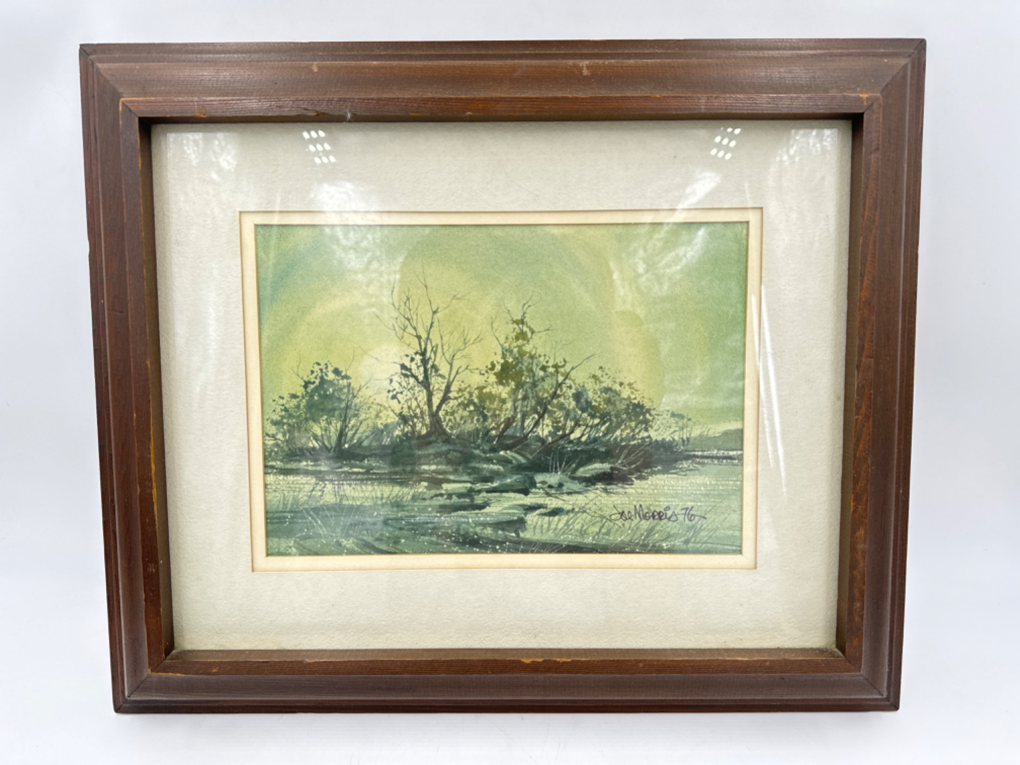1976 Signed Watercolor 'Evening Island' by Joe Morris Frame measures: 17.25 x 14.25" Wood frame has minor wear and art in good condition