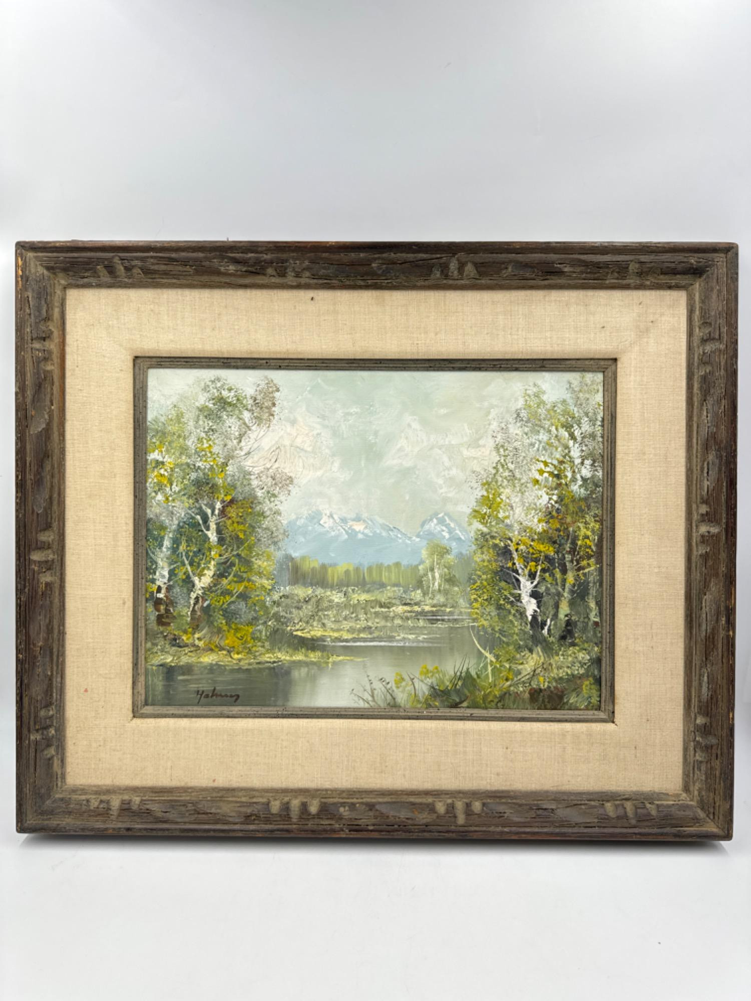 Vintage Signed Original Landscape Mountain Scene Oil Painting Unknown artist Frame measures: 24 1/8 x 20” Frame has 2 red spots on the fabric, minor wear to wood frame