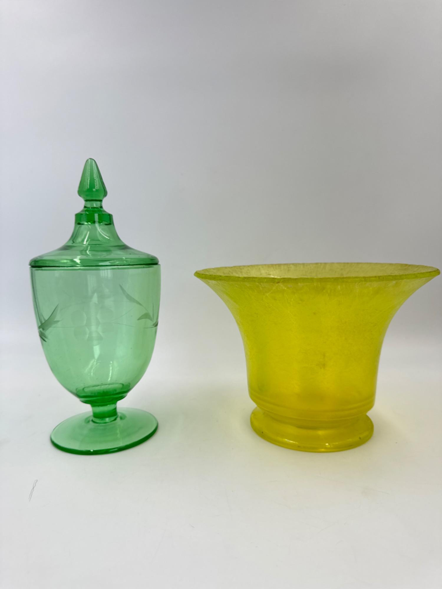Vintage Uranium Glass & Vaseline Glass Floral Etched Uranium Glass Candy Jar - 10"T - has minor flea bites to interior of the rim Possibly Fenton - Topaz Opalescent Vaseline Glass Vase - 6"T x 8.5"W **This vase has the same texture as Velva Rose Fenton pieces - not quite satin, but almost fine grit. Hard to tell the condition of the rim as it has a Velva Rose feel, yet is dirty making a clear assessment impossible.**