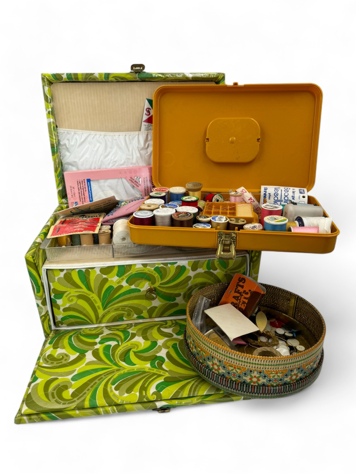 Retro Sewing Notions 13 x 8 x 2.5" Mustard yellow plastic case KC Products Co Cozy Home Accessories Mod Green Quilted Vinyl Sewing Box - 15 x 10 x 8"T Has damage to back corner