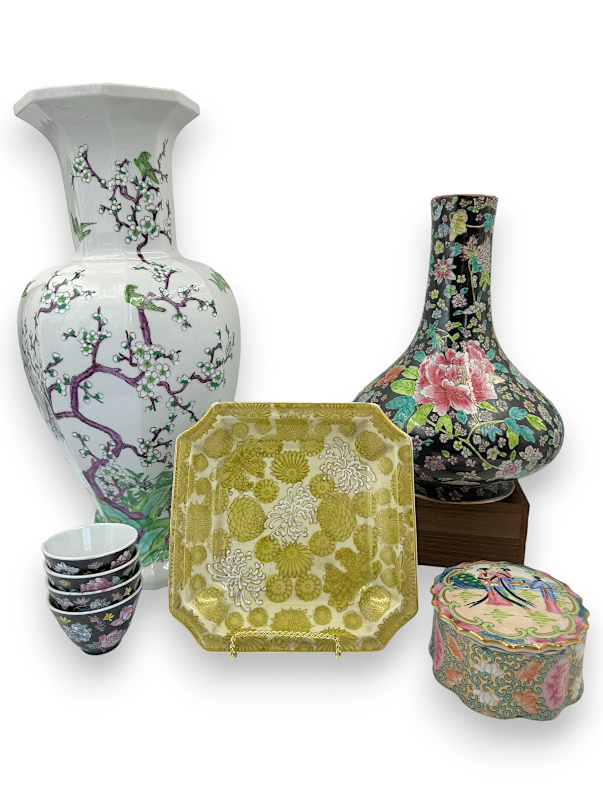 Vintage Chinese Republic Period Black Noir Vase - Famille Rose Trinket Box + Large white vase 18.5"T Chinese Republic Period Black Noir Vase - 12" Beautiful Chinese Famille Rose Trinket Box - 4.75"D x 2.5"T (4) Chinese Republic Period Black Noir cups - 2.25"T Some of the items have sticker residue on them, plate needs cleaned