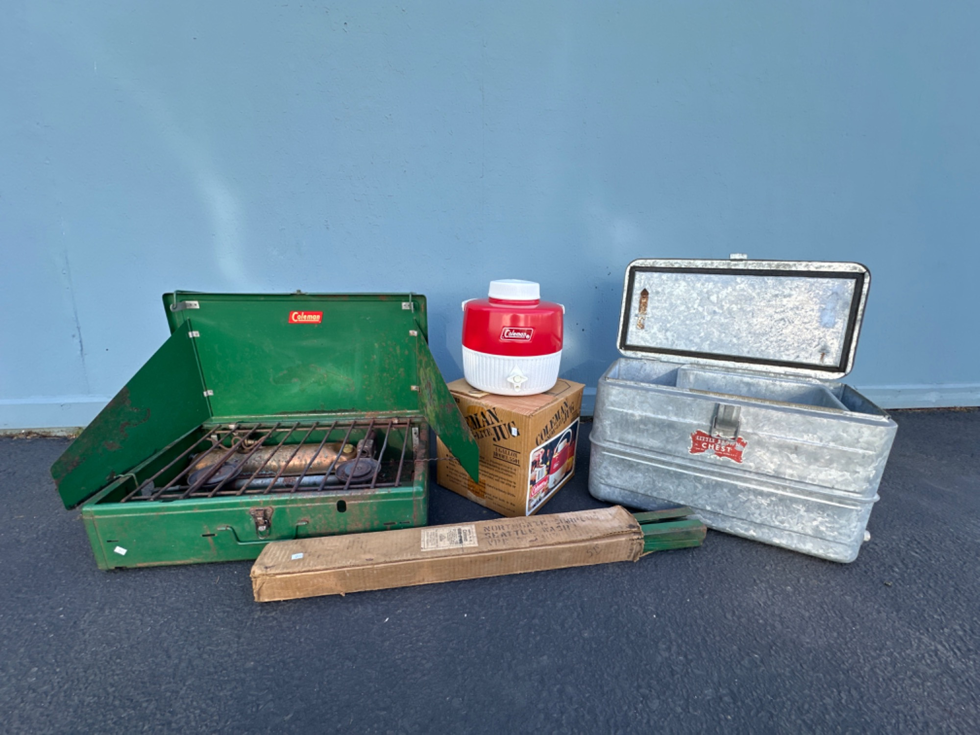Vintage Little Brown Ice Chest Cooler is 10 x 19 x 12.5“ - has accessories Vintage Coleman 413E 2 Burner Camp Stove with Model No 10 Stand Coleman Snow-lite Jug - 1gal - like new in box