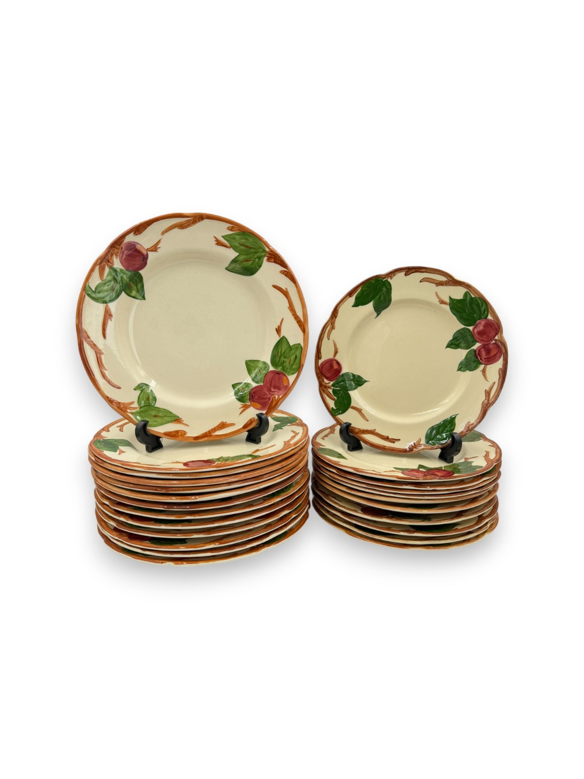 Franciscan Apple Dinner & Luncheon Plates (11) 9.5 inch luncheon plates - 4 with noted chips (13) 10.5 inch dinner plates - one with noted flaw Minor to know utensil wear Variety of back stamps, made in England, USA, & California