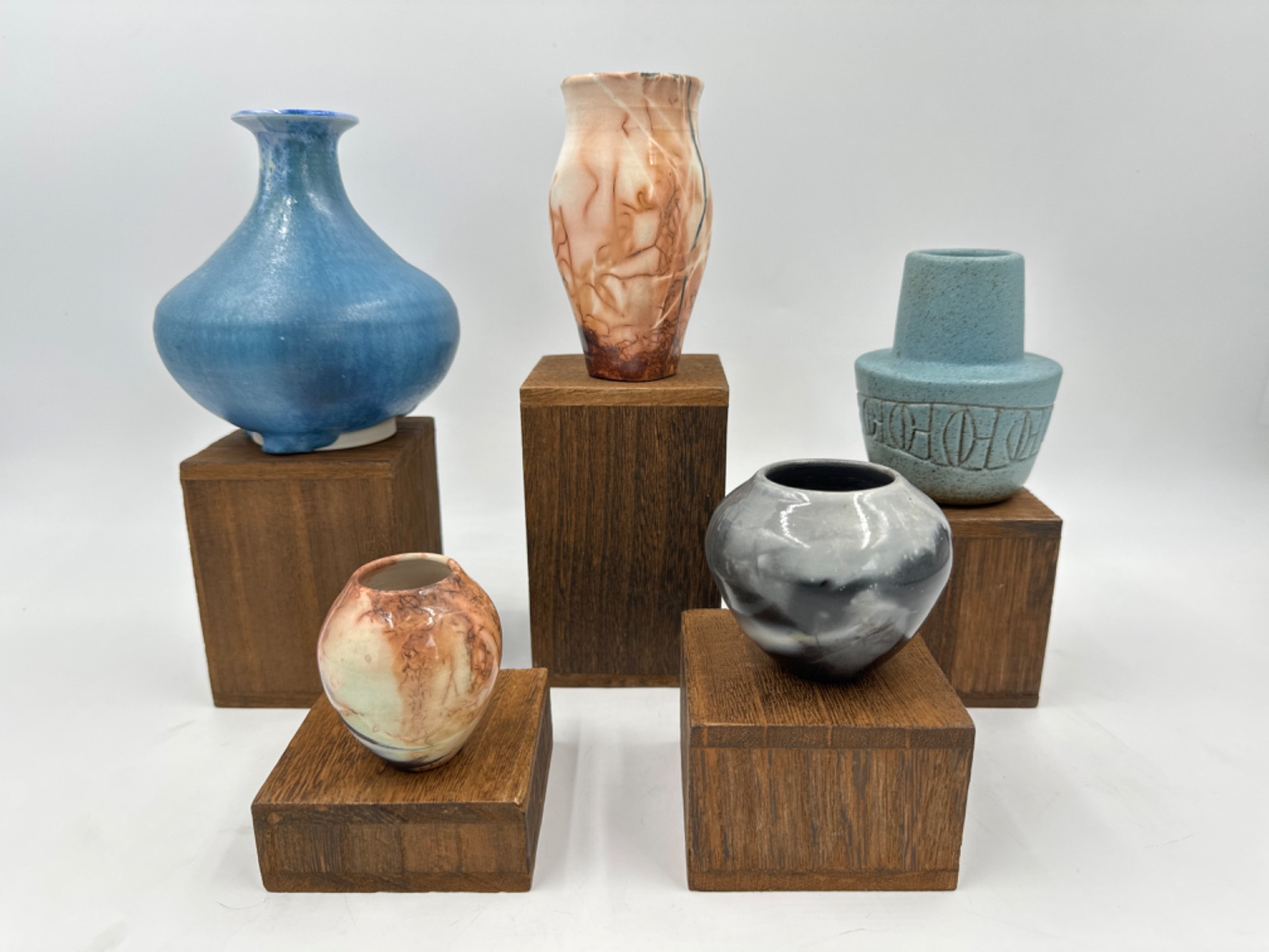 Studio Art Pottery Minis - Horsehair Vases - Crystalline Glaze (2) signed Horsehair & Pitfired Judy Harper member WPA ceramics - 3rd appears to be the same maker, but is unsigned Blue drip vase with spectacular crystalline glaze Items measure between 2.5" - 5.25"T Also includes a 6th damaged geometric pottery