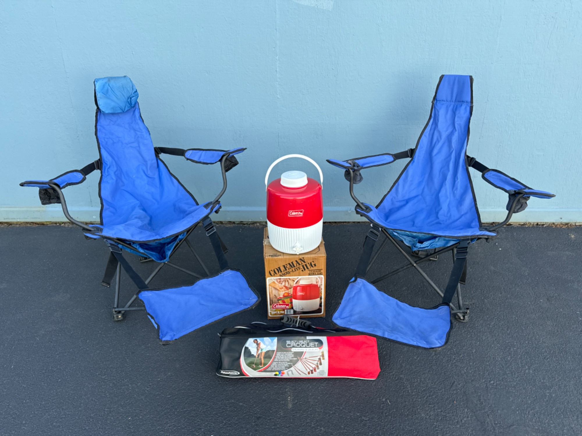 Enjoy the Outdoors - Folding Chairs, Coleman Jug, & NEW Croquet Set (2)Folding chairs with footrests - used Vintage 1gal Coleman Snow-Lite Jug - some wear to the red paint, rust beneath? New! 6 player croquet set