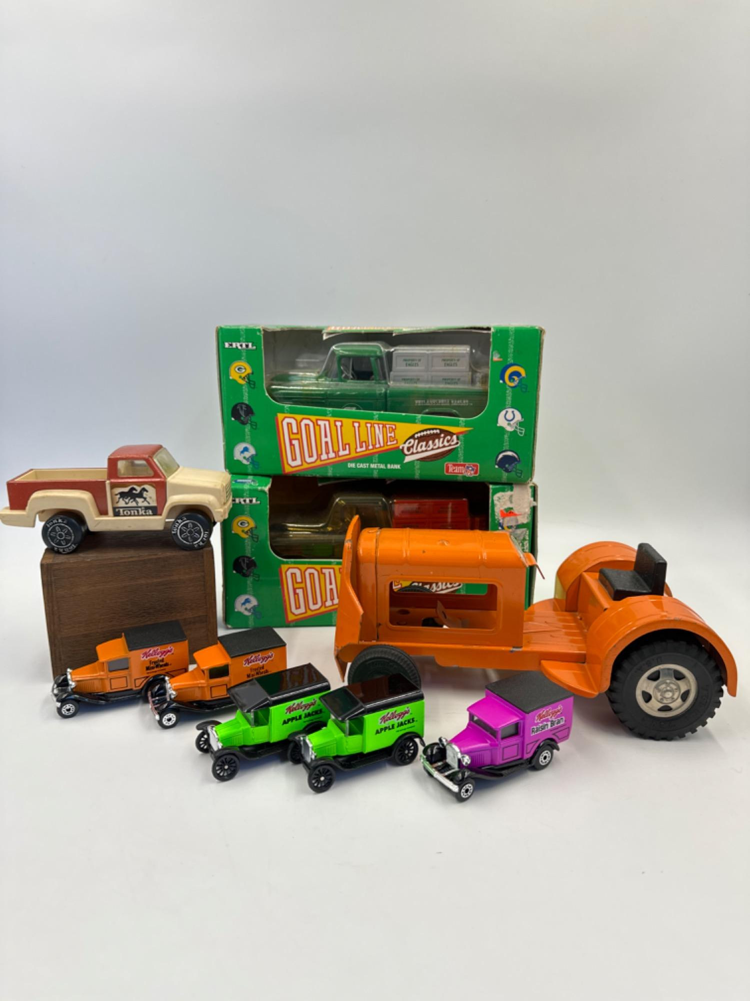 1970s Kellogg's Matchbox Cars - EXCELLENT Condition Tonka Metal Airpot Tractor - missing several parts 1979 Tonka Cowboy Ranch Pickup Truck - wear In box Ertl Goal Line Classics Eagles & Bills Truck Banks