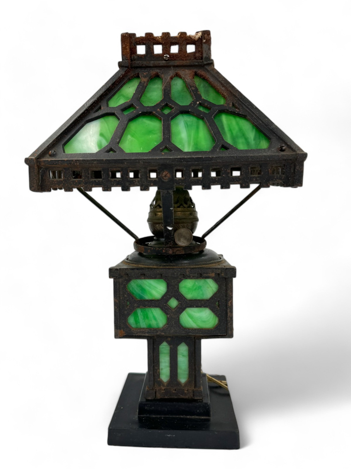 Antique Bradley & Hubbard Arts and Crafts Cast Iron Green Slag Glass Lamp Oil converted to electric - untested Project piece - needs restoration Base is solid black glass with a cast-iron top. Green slag glass inserts. Base measures approximately 14"T - one panel of slag glass is cracked Glass base has chips - 6.75"W Unsure if top goes with this lamp. Measures: 10"T Has rust and three of the panels have damage
