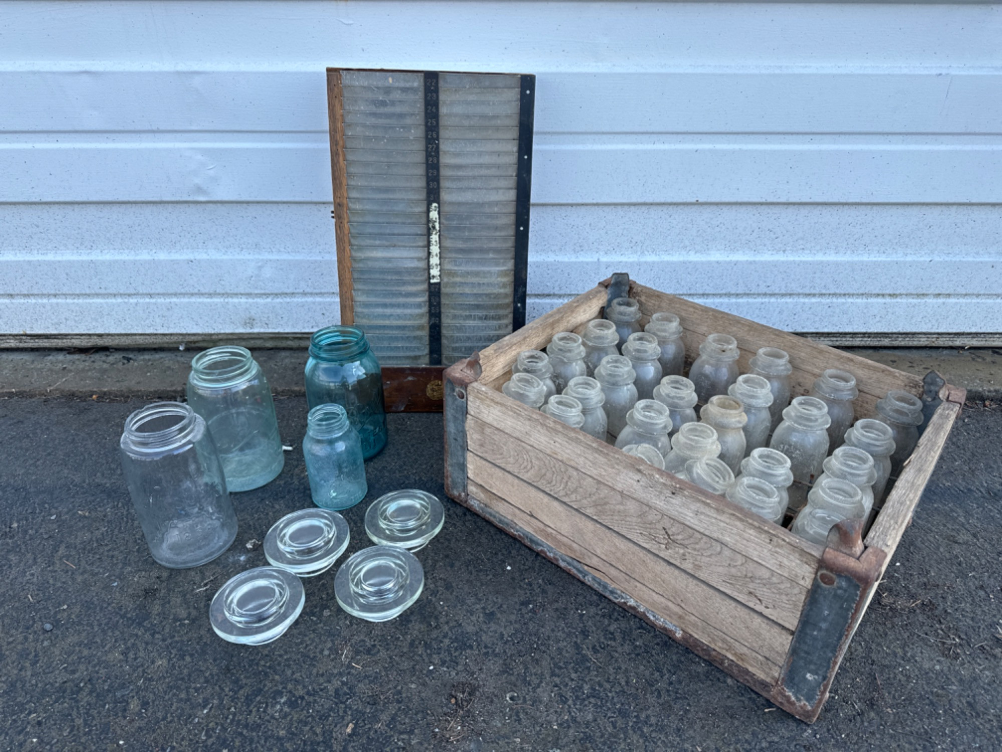 Crosby dairy milk crate with bottles - 18 x 14.5 x 9” to the top of the metal bit The Hotel Monthly Room Rack Ledger System Time Card Rack Plus glass lids and Ball/Mason Jars