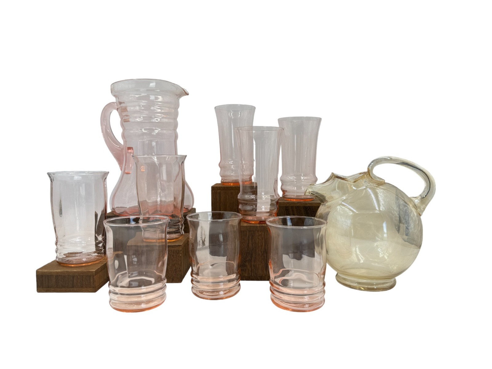 Pink Depression Glass (5) MacBeth-Evans Optic Rib glasses set - 4" & 5.5" (3) Dunbar 5"T Pitcher has crack on handle - only at top of the handle Measures approximately 9"T 1930s Cambridge Glass Tilt Ball Pitcher Jug - Peach iridescent - 7"T to top of handle