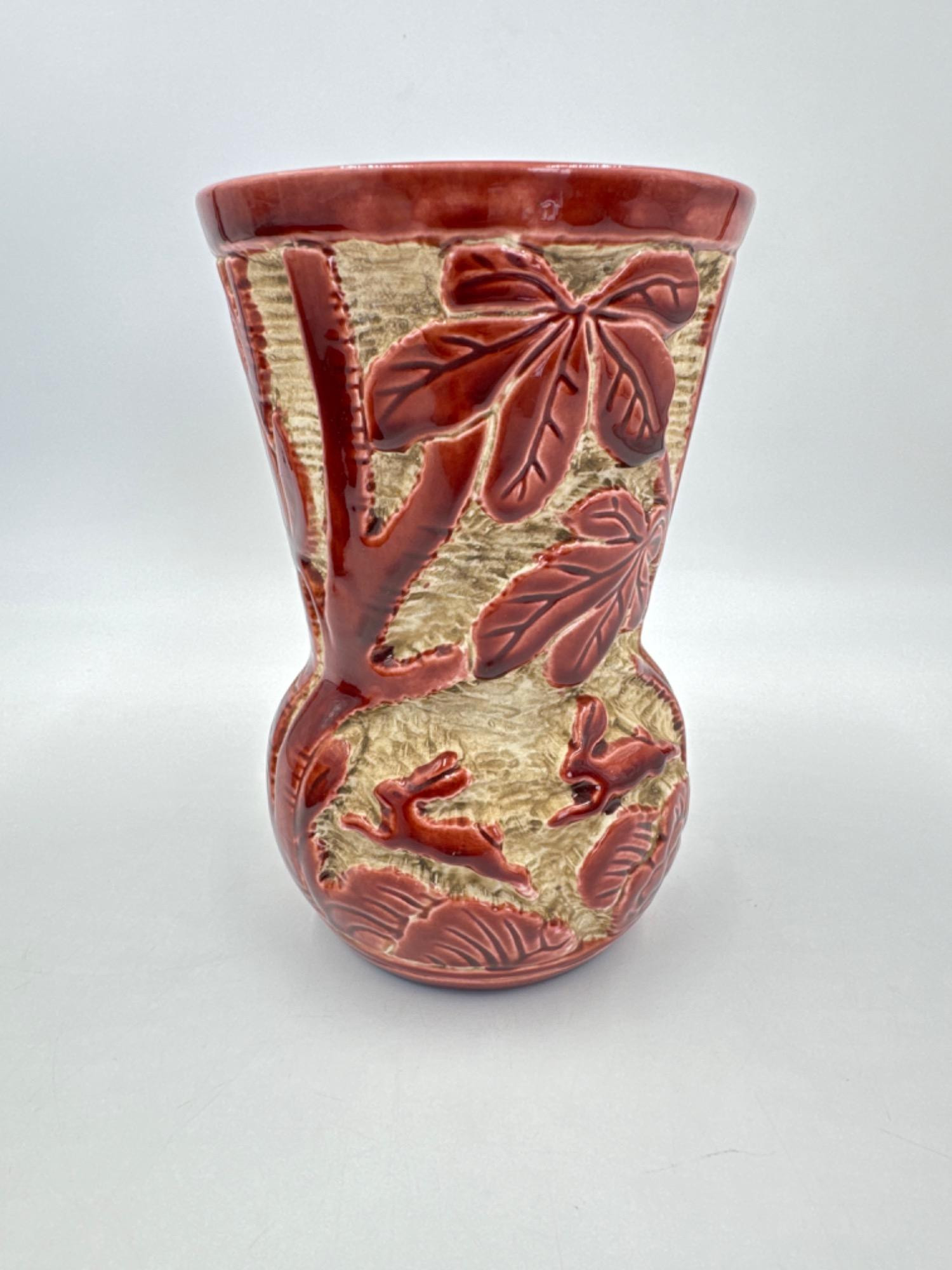 1930s Trentham Beswick Ware John Beswick Pottery Vase #677 This beautiful Beswick pottery vase is decorated with an embossed forest scene and two leaping bunnies in a red finish and a tan background. The mouth has a diameter of 4.75" and the brim and stands 7 1/8" tall. No chips or cracks.