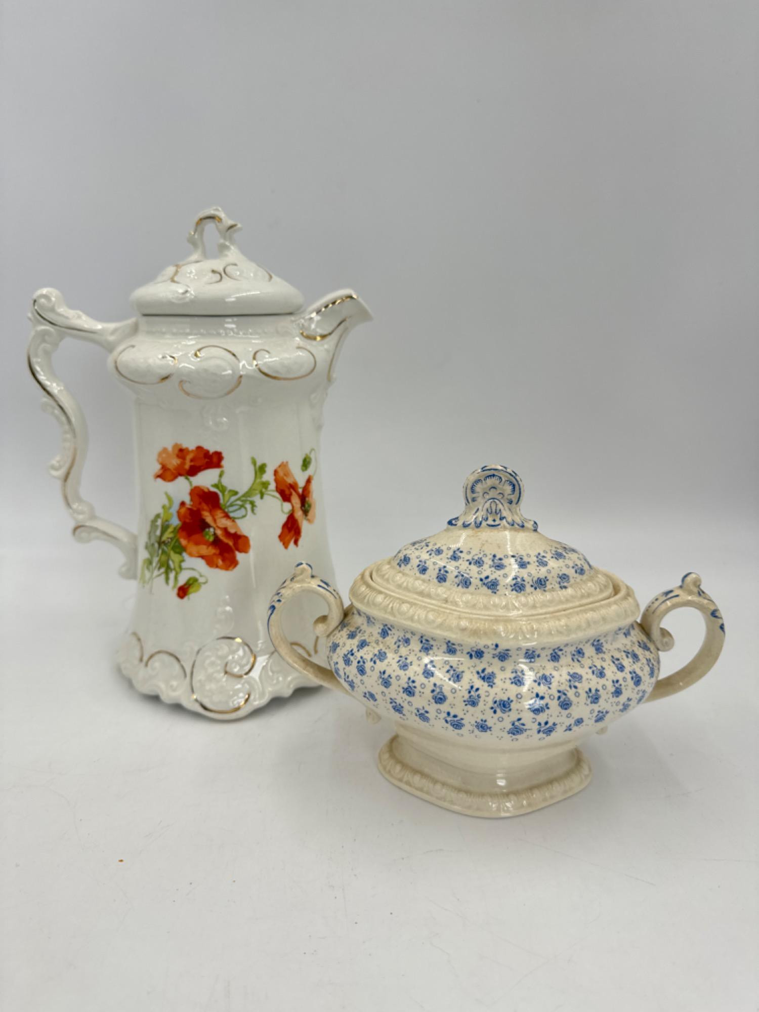 Lovely antiques Copeland Spode China Centurion Gossamer Sugar Bowl - needs cleaning, has chip to inner lid rim 655 La Belle Chocolate pot - 10"t has an expertly repaired lid piece, crack on the side does run internally
