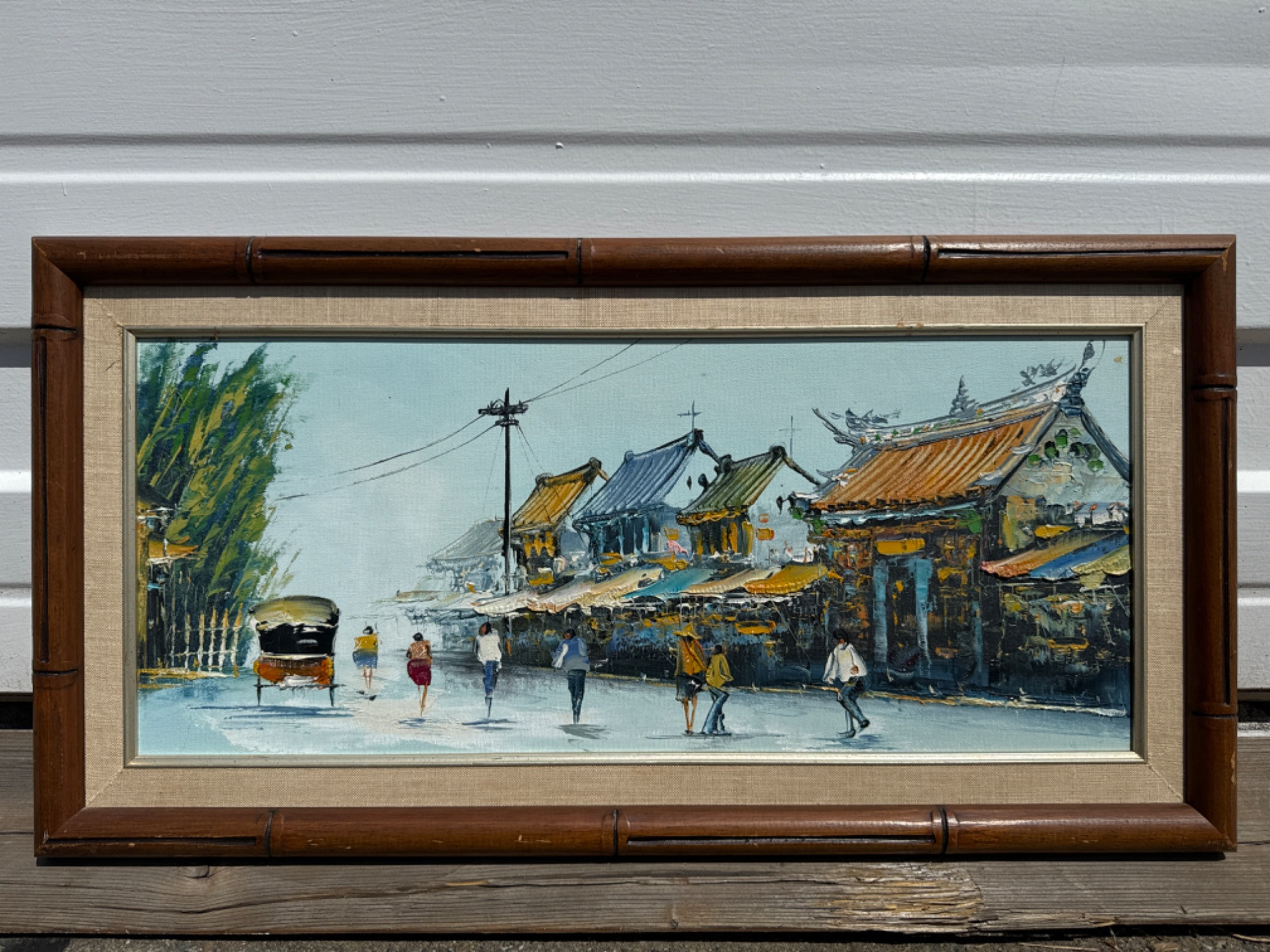 Mid Century Original Asian Market & Street Scene Painting Vibrant colors and great texture Frame measures: 22.5" x 12.5"