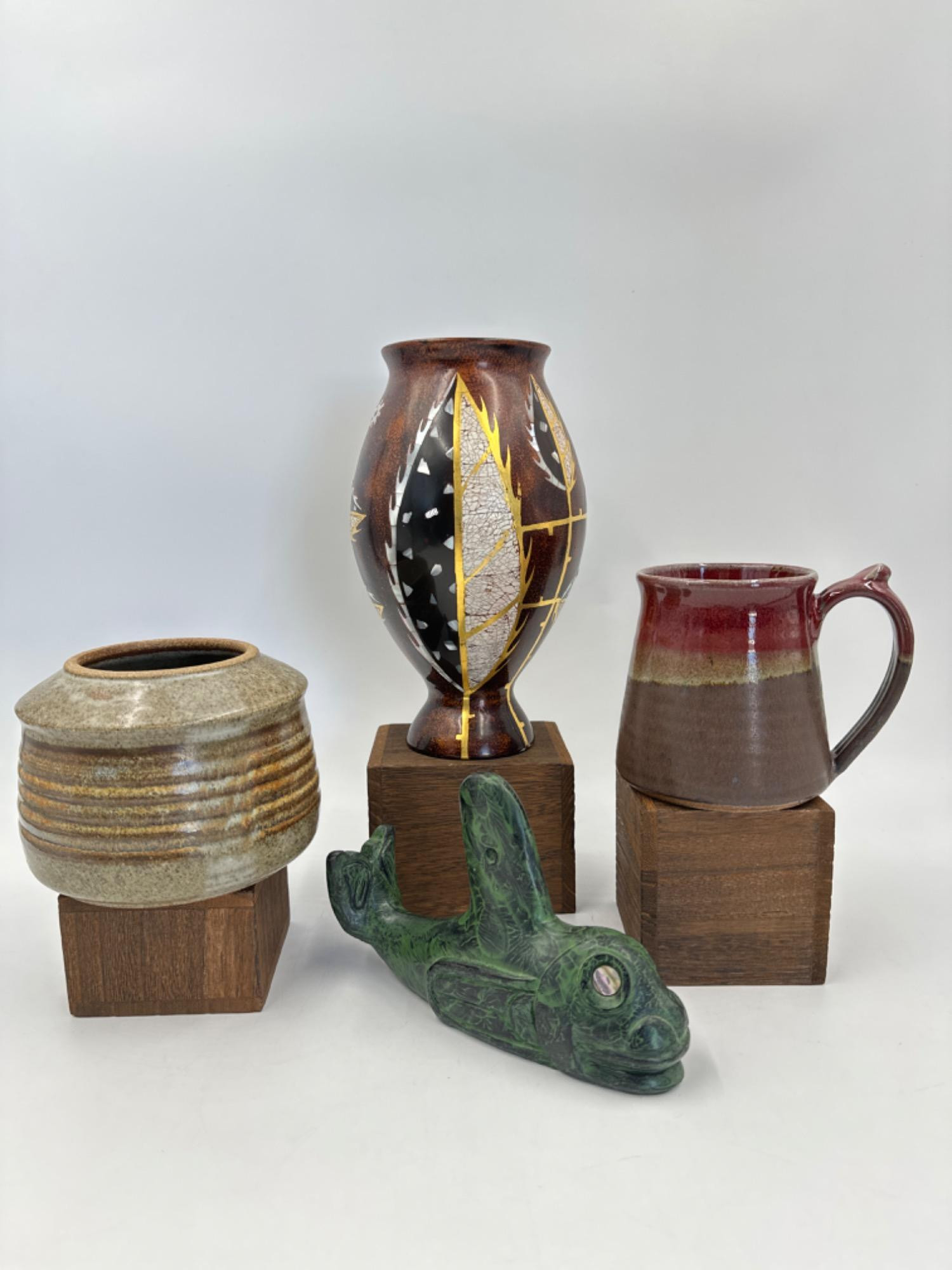 MCM Vietnamese Lacquerware Vase with Inlaid Shell - 8"T Pottery mug signed - 4"T Vintage Greg Wolf Canadian Inuit Haida Whale - 6.25"L x 4"T - mother of pearl eyes,missing these on fin