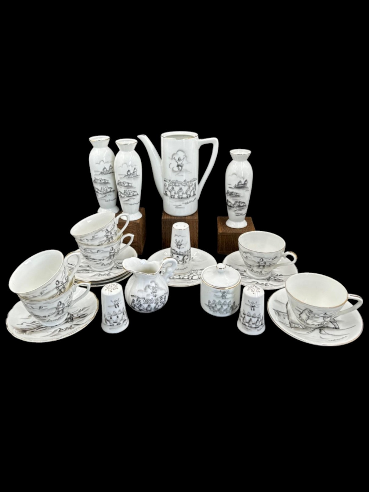 Vtg Alaskan Inuit Robert Mayokok Porcelain - Vases, Teacups & Saucers, Teapot + Includes 6 cups - 4 matching with some wear on the rims of the cups (7) saucers, two with wavy edges (3) vases 6.5"T Cream and sugar, salt and pepper, additional shaker and teapot with no lid