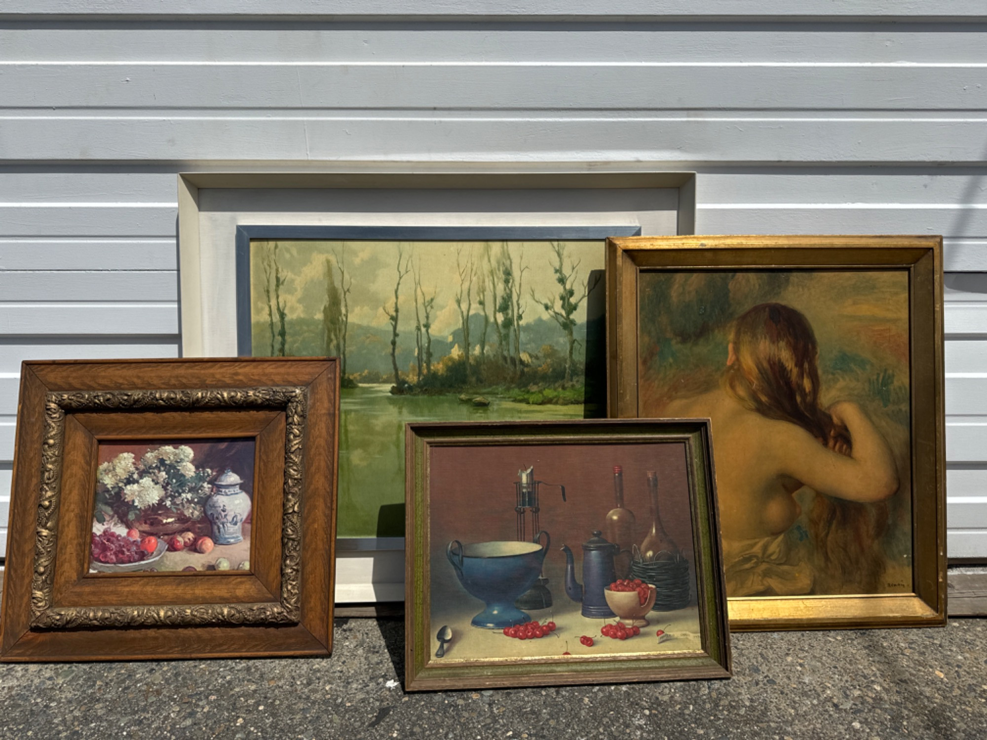 Proferio Grossi, Girl Combing hair by Renoir, Still life with Delft vase by Rudolph Colao in antique Tiger Oak frame, and "Autumn Morning" by Gregoire Lavaux Smallest measures 22.5 x 18" Largest measures 39.25 x 33.25 x 2” deep Wear to frames and prints, please see photos