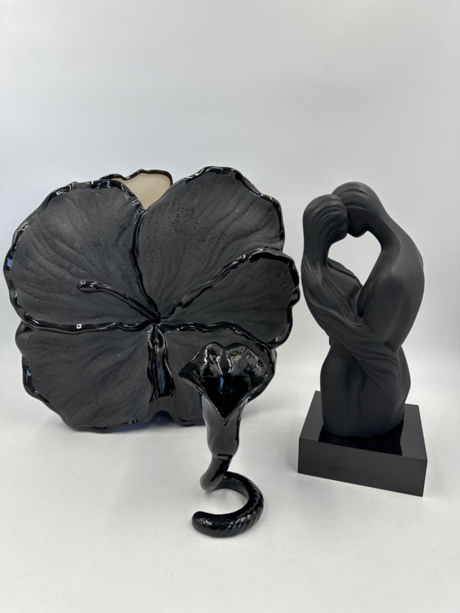 1992 Ceramics-N-More Black hibiscus vase - 11.75”T x 12.5" Fitz & Floyd Vintage Black Calla Lily Candleholder 5”T Austin Embrace Sculpture, Signed Boris 11”T x 4 5/8” base