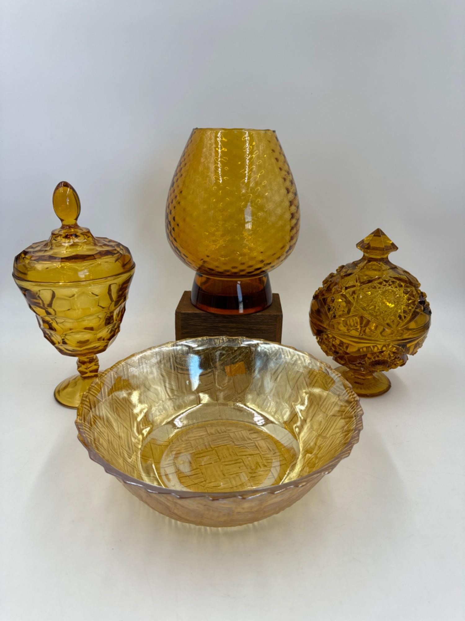 Tall amber vase is approximately 6.5 x 8“ tall - has "Made in Italy" on base Spherical amber glass candy jar with lid stands 7.5 inches - Possibly Imperial Glass MCM Amber Glass Viking Georgian Honeycomb Lidded Apothecary Candy Jar - 9.25 inches tall Woven marigold carnival glass bowl is 9" x 3“