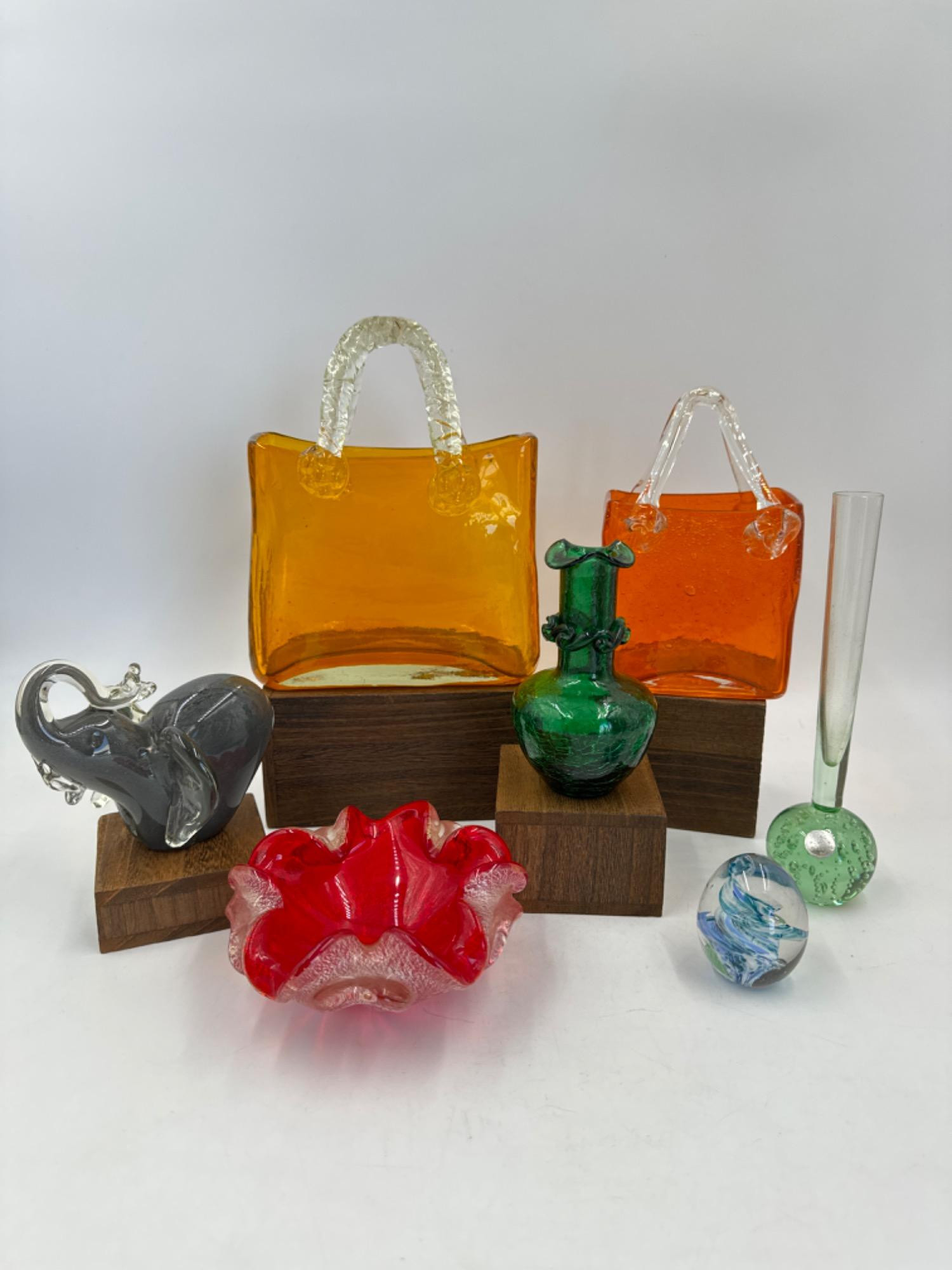 Swedish art glass bud vase Murano Venetian Red Glass & Silver Leaf Bowl / Ashtray Pilgrim Hand Blown Emerald Green Small Crackle Glass Vase w Ruffle Edge Signed art glass paperweight egg stands approximately 1.25 inches - signed Bijou 91 Amber glass basket approximately 6.5 x 3 x 8” tall Dynasty Glass Elephant No noted flaws