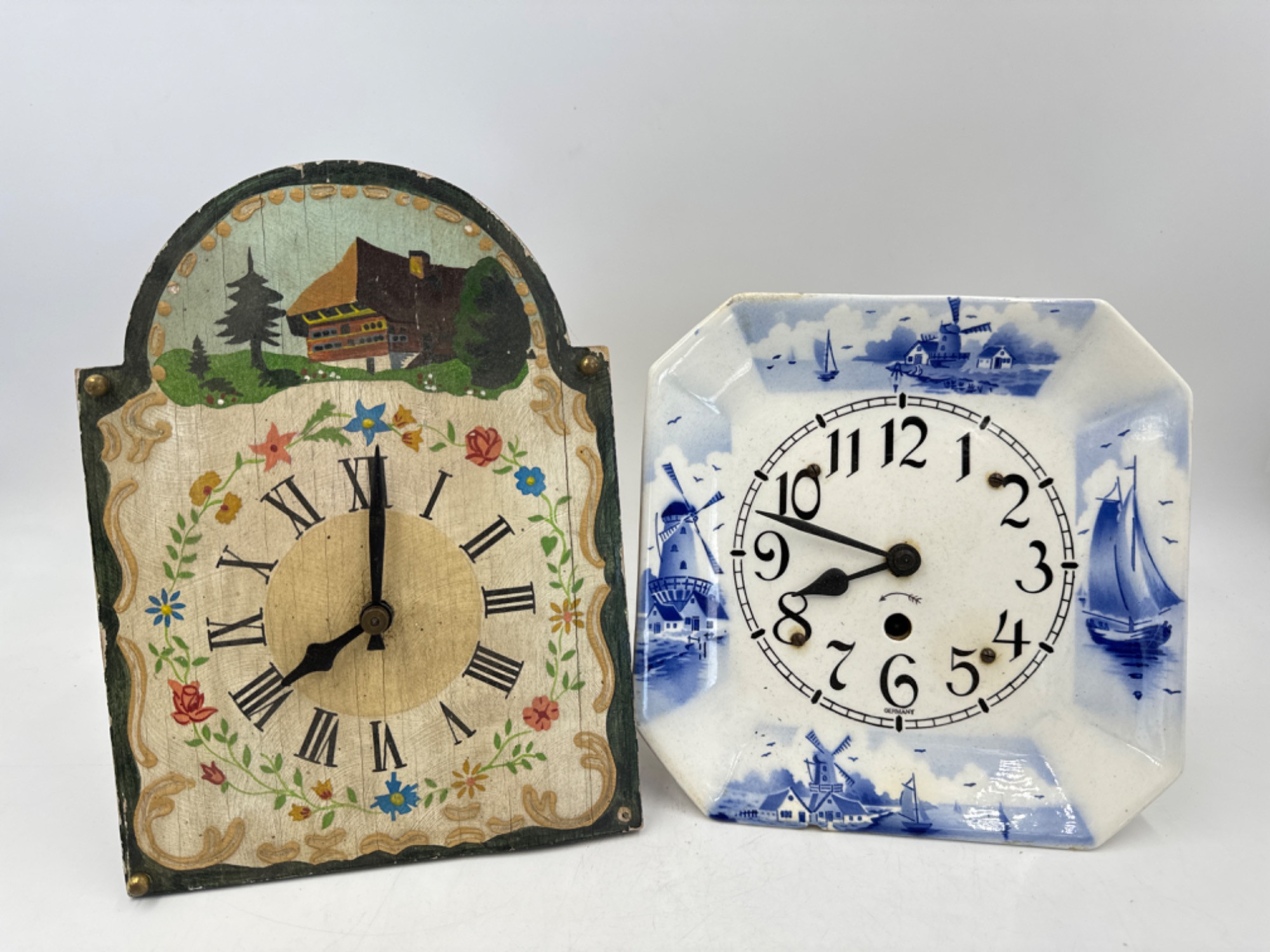 Black Forest-Lackschilduhr German Shield Clock - wood faced clock is 10 x 7.25 x 3.5“ Delft Clock w/windmill motif clock is 8.25 x 8.25 x 4“ Untested