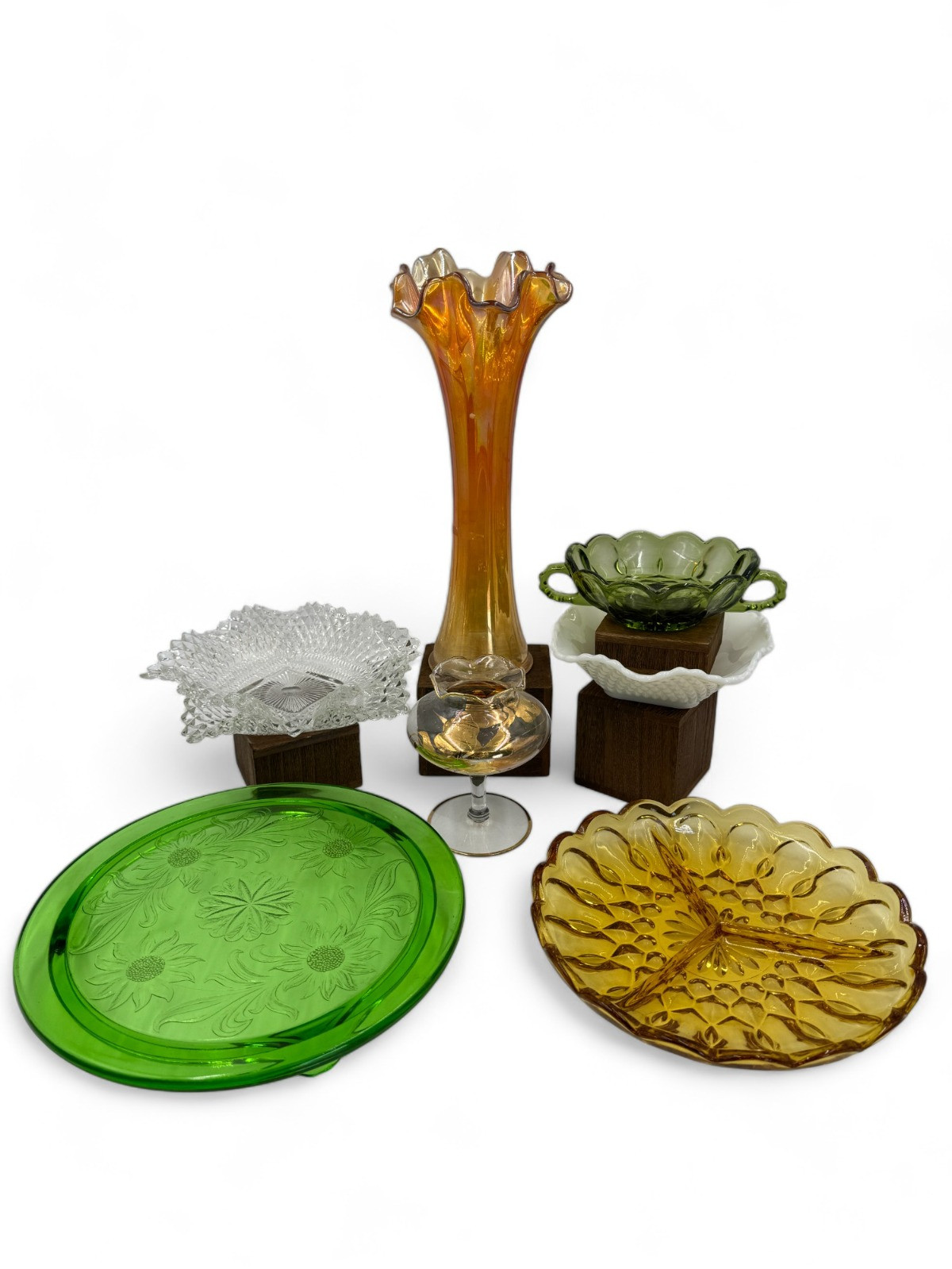 11.75"T Marigold Carnival Glass swung vase Anchor Hocking Fairfield 8.5" Relish Dish (2) Indiana Glass Candy/Nut Dish 6.75" - one has chip on a point, hard to see and more