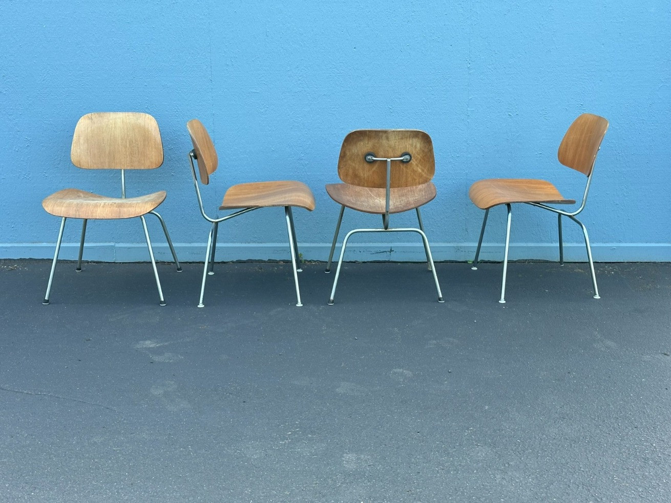 Mid Century Herman Miller Eames DCM Molded Plywood Dining Chairs Needs repairs & restoration. One seat base is no longer attached. Measures 29.5 tall x 19 3/8 inch wide with a seat height of approximately 17.5" "The DCM (Dining Chair Metal), dining chair wood with metal legs, was developed concurrently with the LCW. Charles and Ray had several key objectives in designing chairs. They wanted them to be reasonably priced, light, and durable. It was also important that they follow the body’s natural contours and flex with a person’s movements." https://www.eamesoffice.com/the-work/dcm/