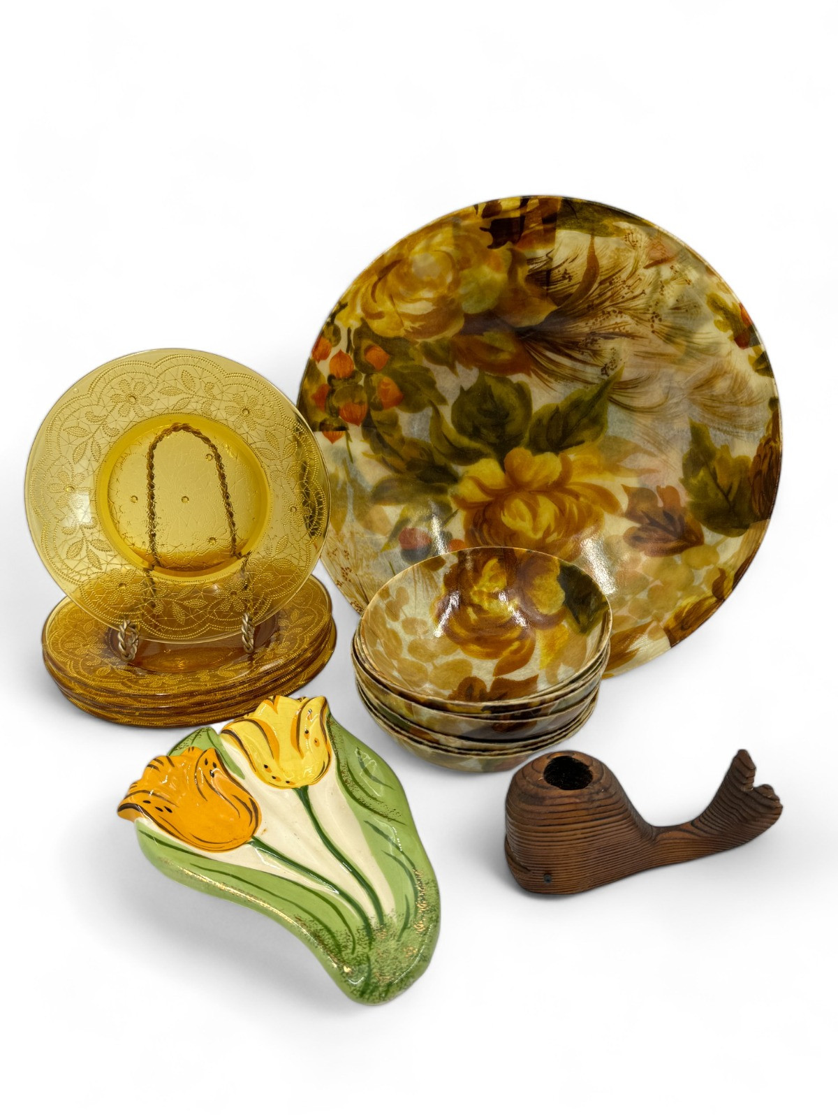Lot # 12 - MCM Floral Fiberglass Bowl Set - Amber Sandwich Glass Plates +