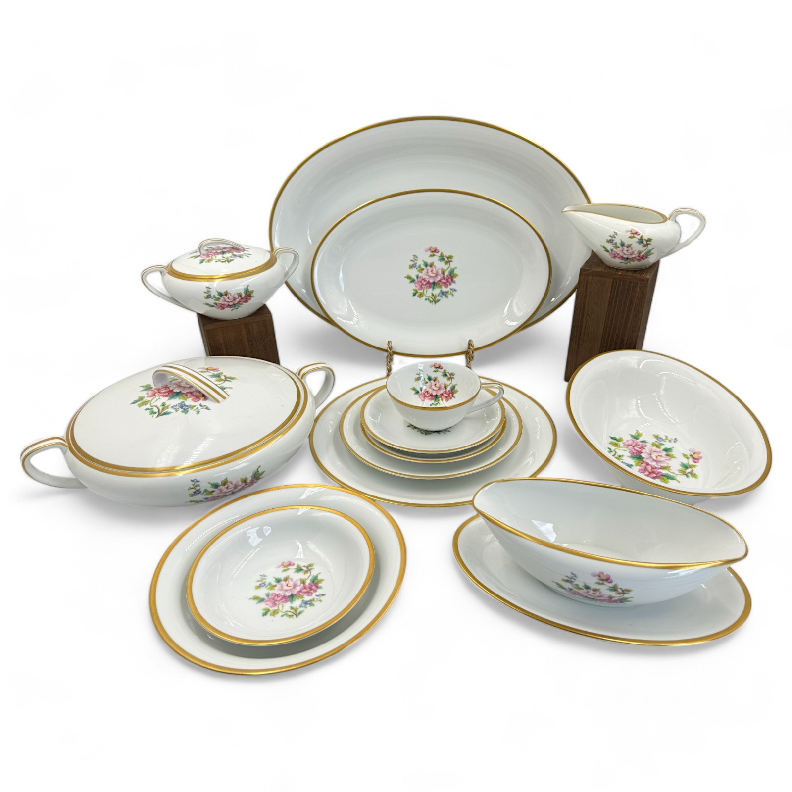 10 complete settings (11) 5.5" bowl (10) 6.25" plate (11) saucers (12) cups (12) 8" plate (12) 7.5" bowl 10.25" Oval bowl Platters are 16" and 12" Lidded Round bowl Creamer & Sugar "Large, gold “M” encircled by a wreath. This “M” stood for their namesake, Morimura, and was used until World War II." Like new condition