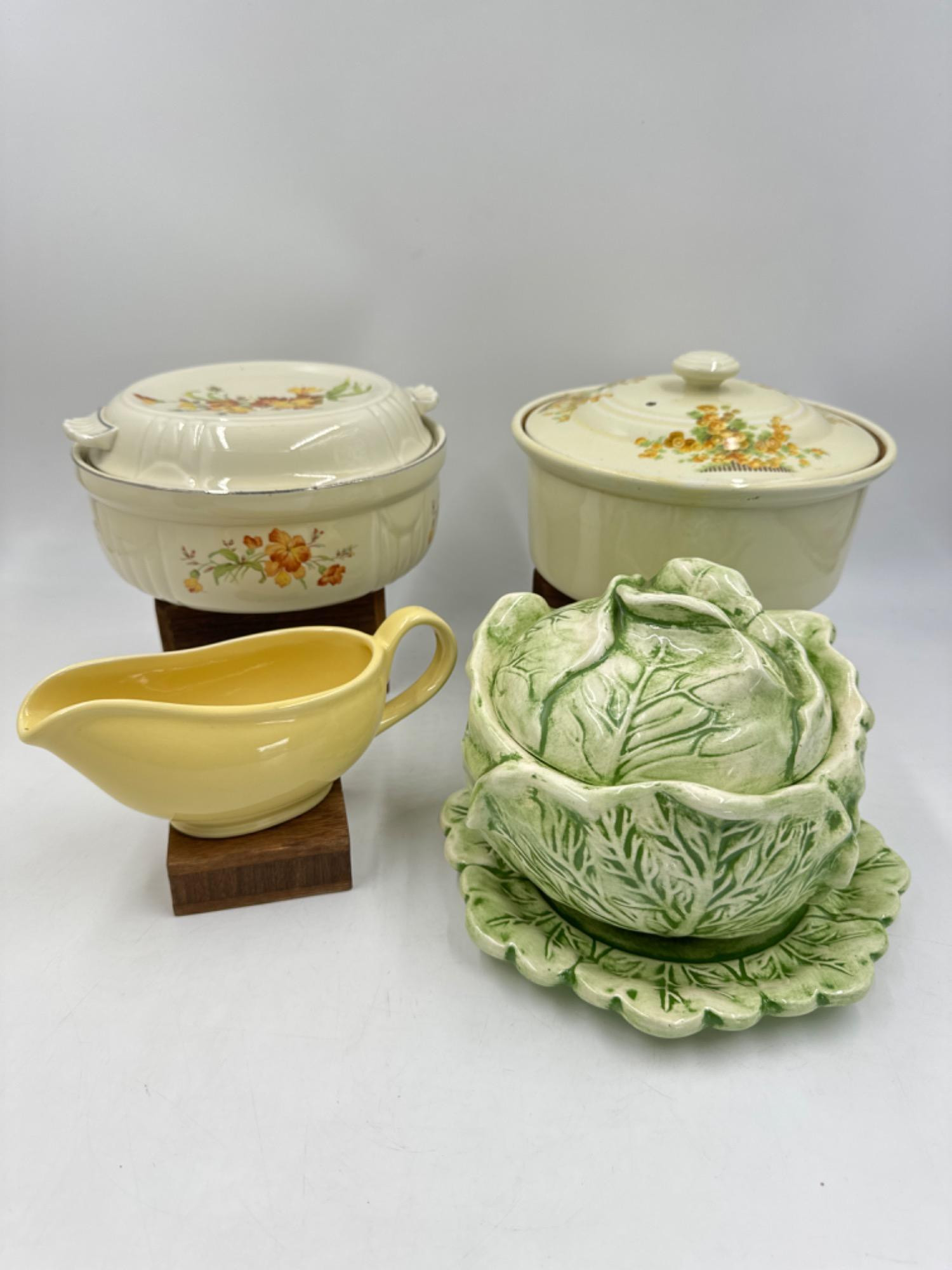 Hall Lidded Casserole Dish & Unmarked Dish - approximately 8.5 inches in diameter 3.5 inches tall Gravy boat is approximately 8 inches handle the spout 3 piece Holland Mold Ceramic Cabbage Lettuce Serving Bowl Dish & Plate