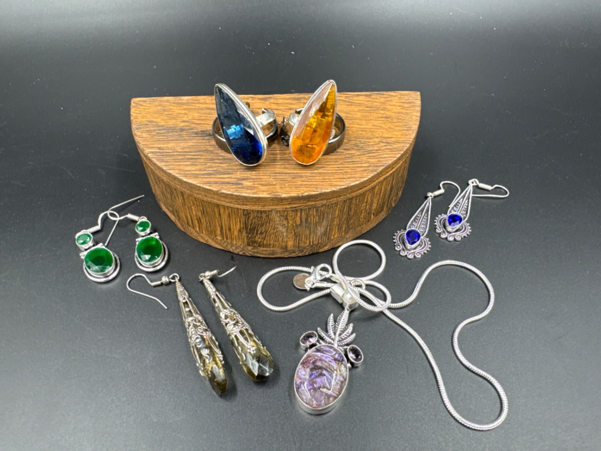 Lot # 82 - Sterling & Colored Glass Jewelry - Rings, Earrings, & Necklace
