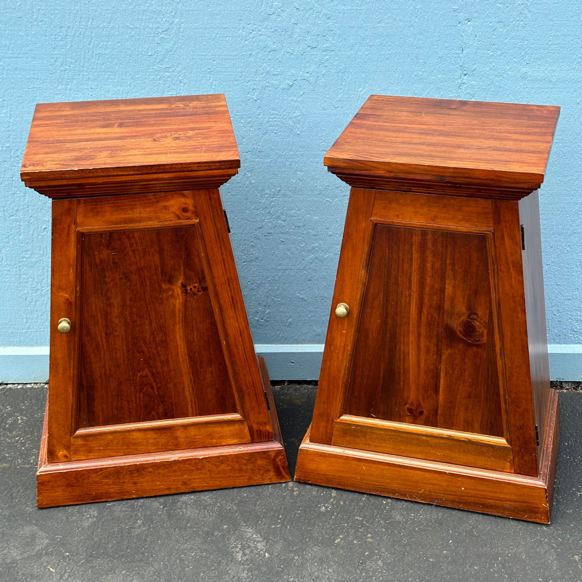 Vintage Pier 1 Pyramid Collection Pedestal Cabinet Pair Bases are 22 x 15“ Tops are 15.75" The height is 31" Solid wood, majority of wear is near the bases