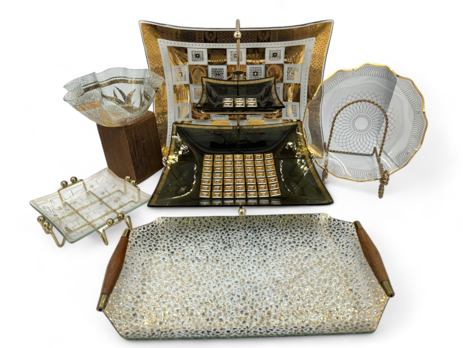 Georges Briard Rectangular Bent Glass Tray - 15.5”L - has scratch to gold Rojack bent glass square 6x6" Dorothy Thorpe Style Small Handkerchief Nut Bowl Danish Modern Spirograph Bowl Large 2 tier tray Handled tray