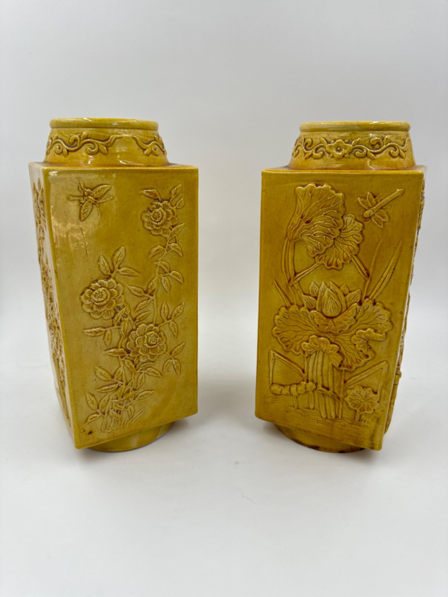 Vintage Chinese Imperial Yellow Porcelain Cong Vase Pair Measures: 11.25 inches tall Lovely condition