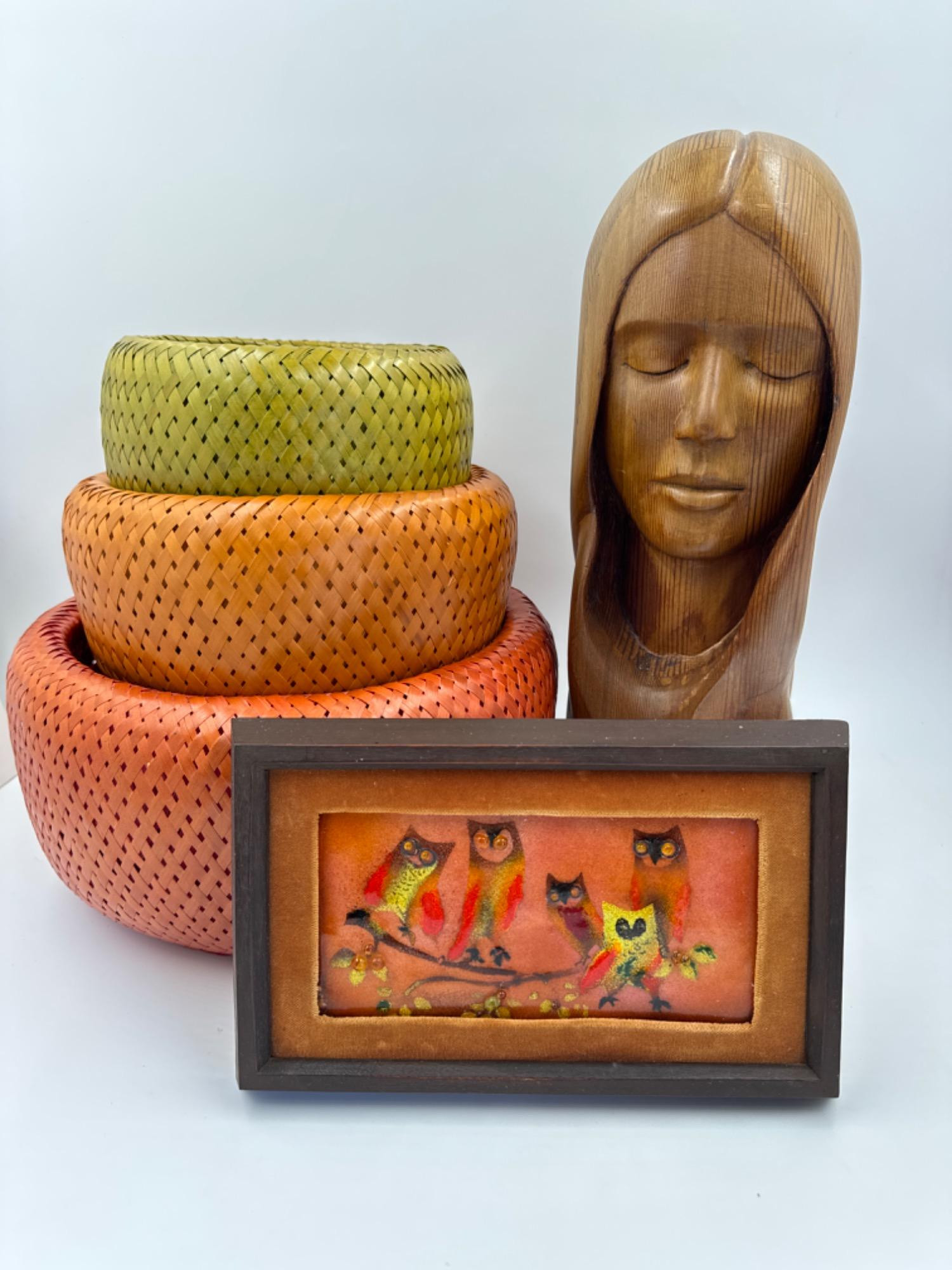 1969 Marie Carp signed carved female bust 15.5”T Vintage 10" x 6" cherry wood frame - Mid Mod Owl Fuse Glass Art by Marianne Cassar Modern double wall bamboo baskets - 7.5”D - 12”D