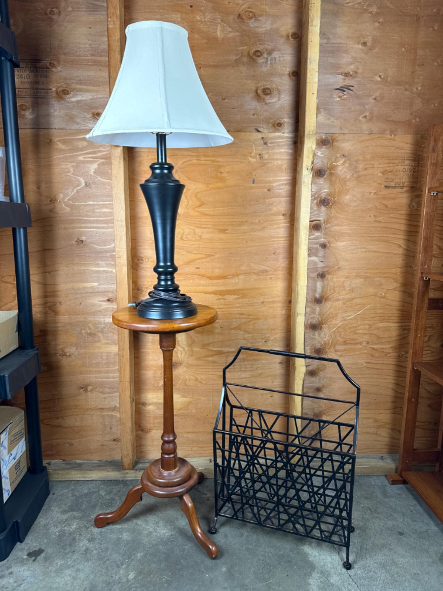 Modern Black Metal Lamp & Magazine Holder - Vtg Solid Wood Stand Wood stand - 26.5” T x 11.75” D Magazine holder - 22.5”T x 15.5” x 7” 29”T metal table lamp w/ tan shade