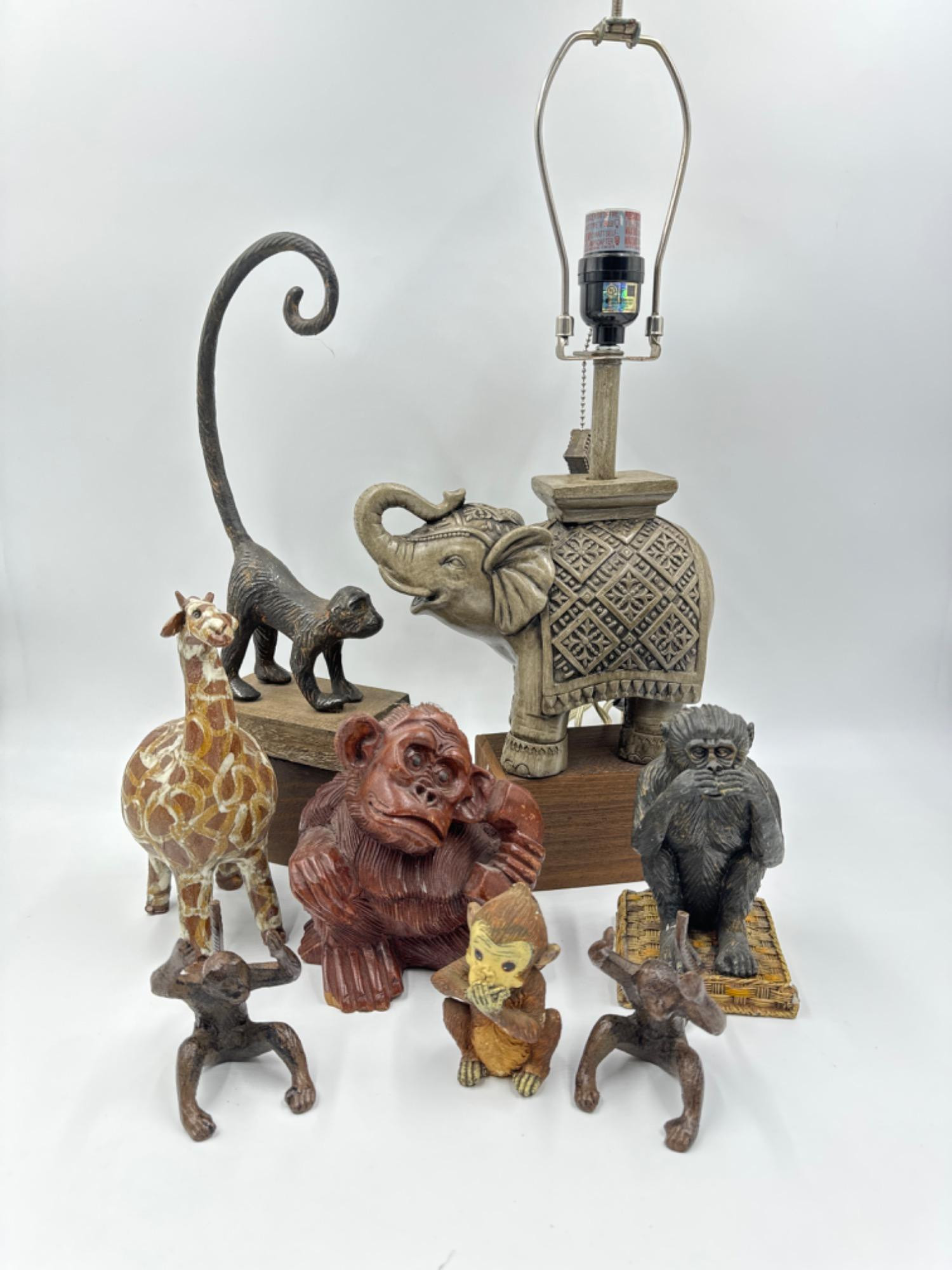 Items range from 3-17.5” Lamp is untested Wood monkey is missing a toe.