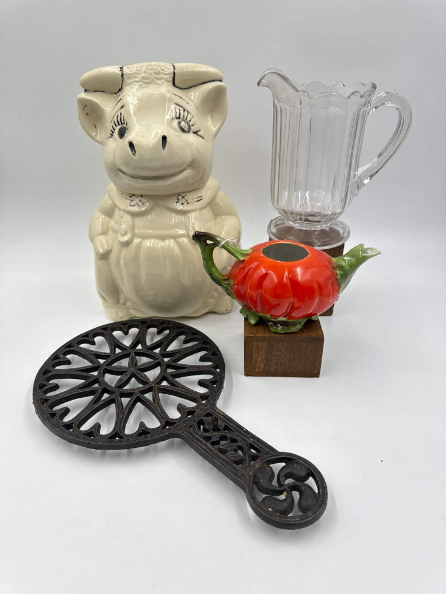 11.5”T APCO cookie jar 7”T pitcher 12.5”L Wilton cast iron trivet Antique Royal Bayreuth Individual Tomato Teapot - no lid