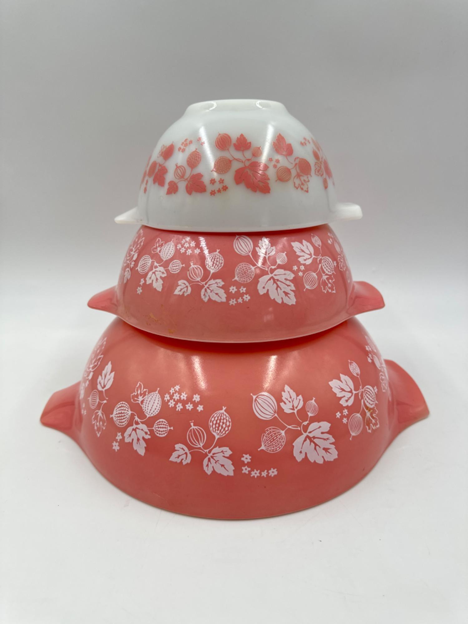 PYREX Pink & White Gooseberry Cinderella Nesting Bowls Missing 442 Needs cleaned, some wear to the exteriors, interior is good