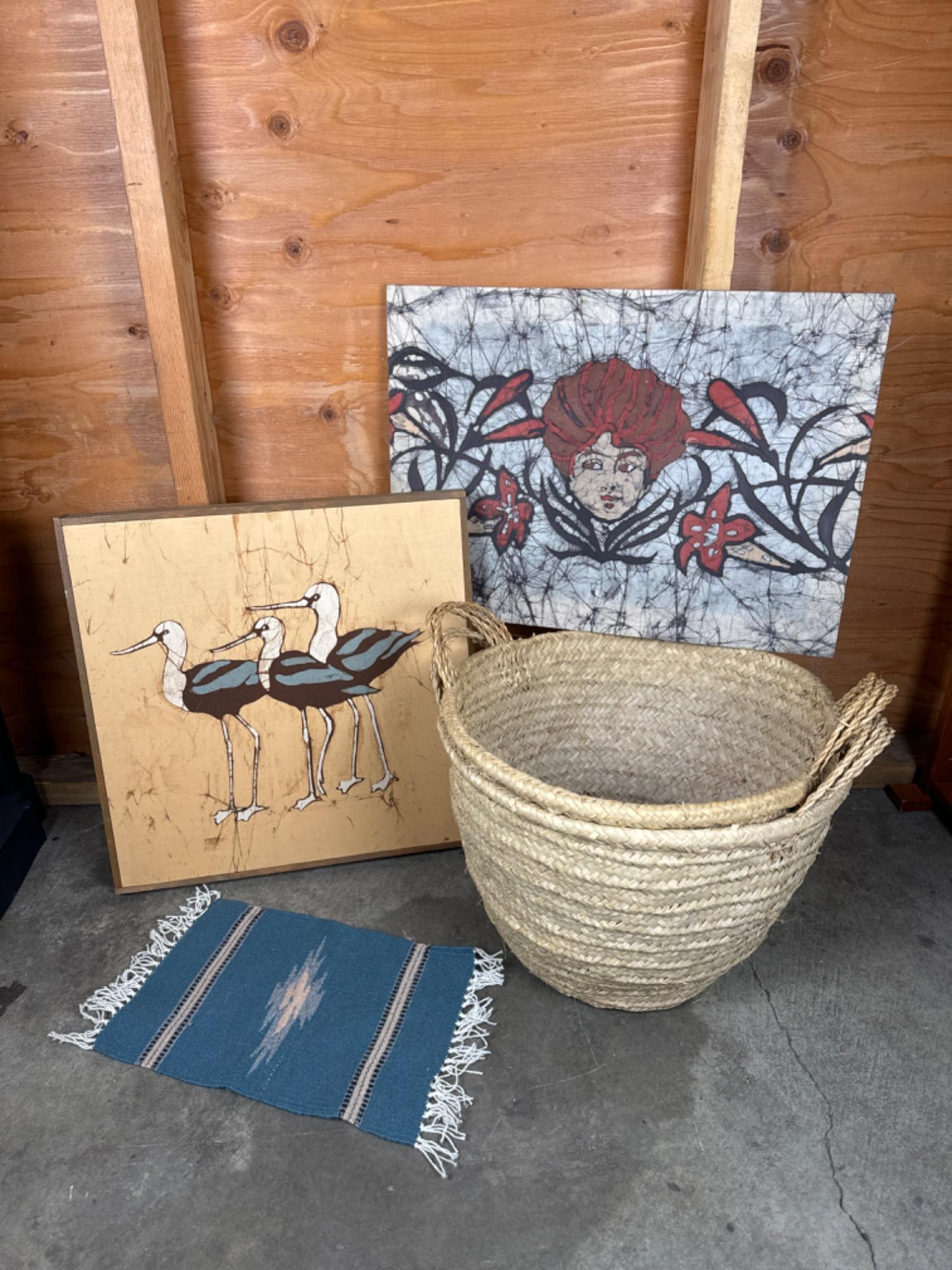 Boho Decor - Batik Art, Chimayo Weaving, & Woven Palm Leaf Baskets Weaving 16”D x approx 10”T Batik 18.75 x 1.75 signed Marlene Yurg Baskets 17.5 x 9.5 Batik 22 x 16 - dirty/spots need clean
